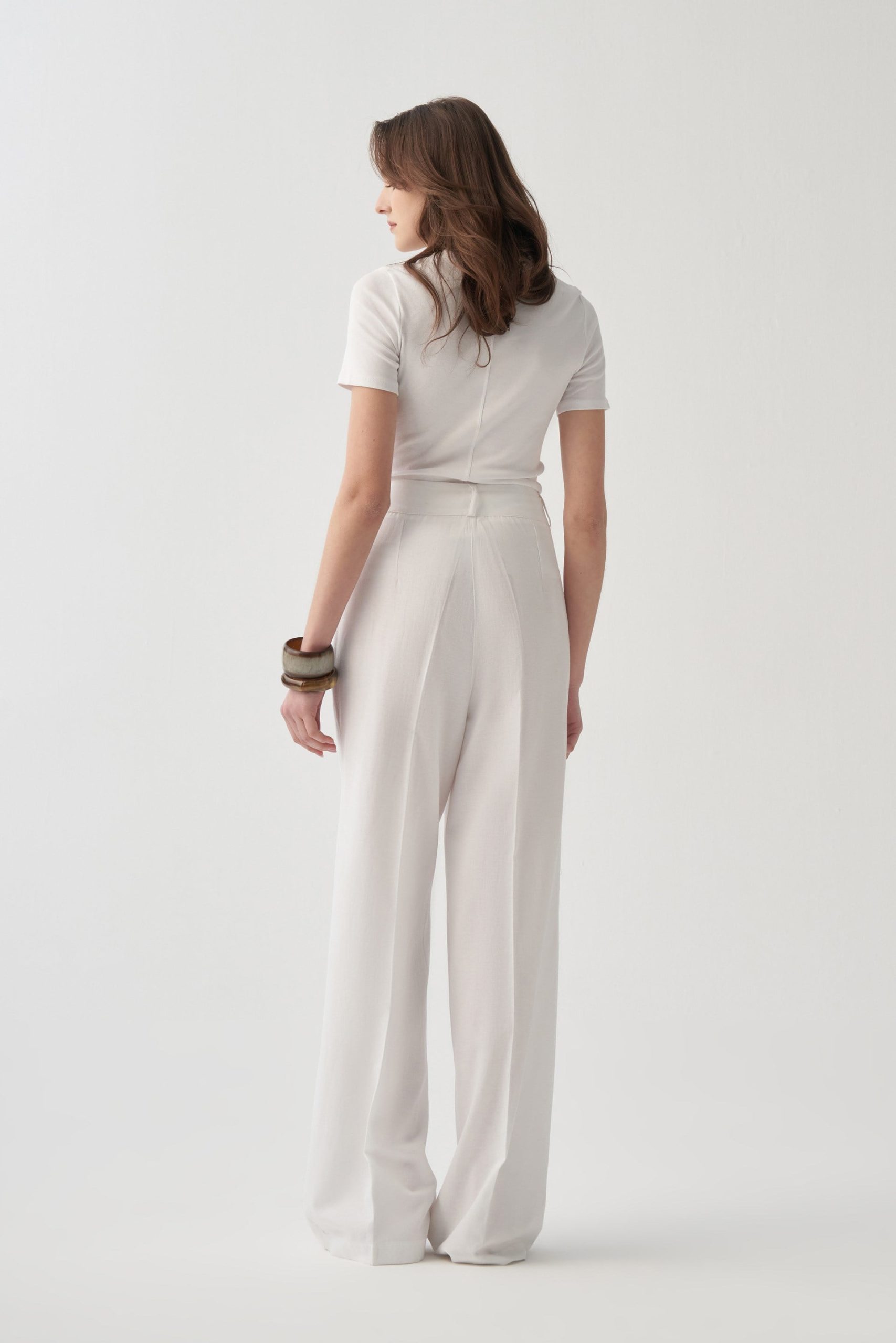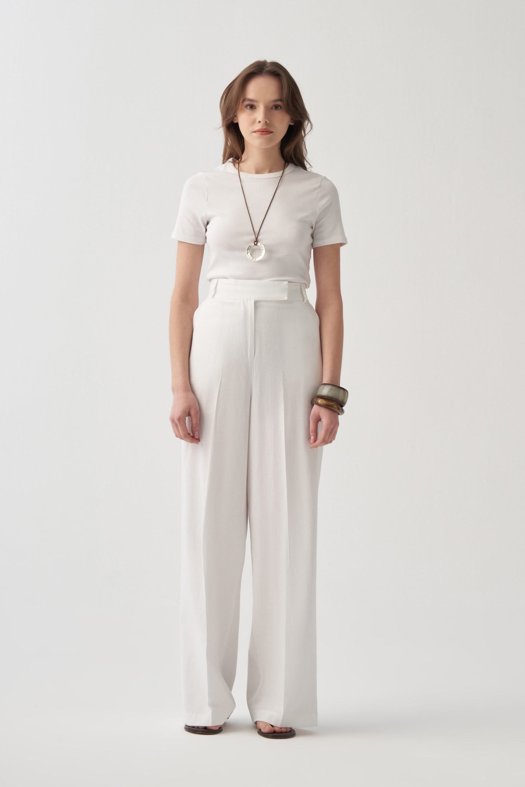Şıklığı detaylarda arayanlara özel Beyaz-Keten Palazzo Pantolon ile zarif bir görünüm yakalayın. Günlük ve özel kombinler için ideal tasarım