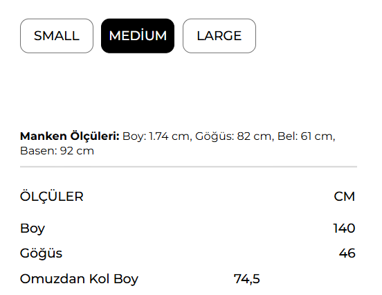 Model Measurements: Height: 174 cm, Bust: 82 cm, Waist: 61 cm, Hips: 92 cm