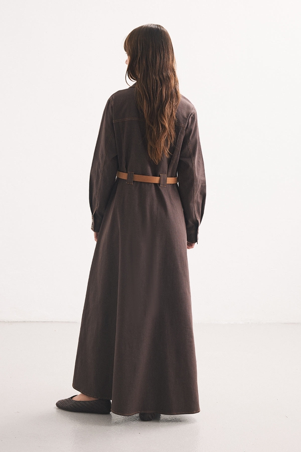 Bitter Coffee Belted Dress with Denim Look