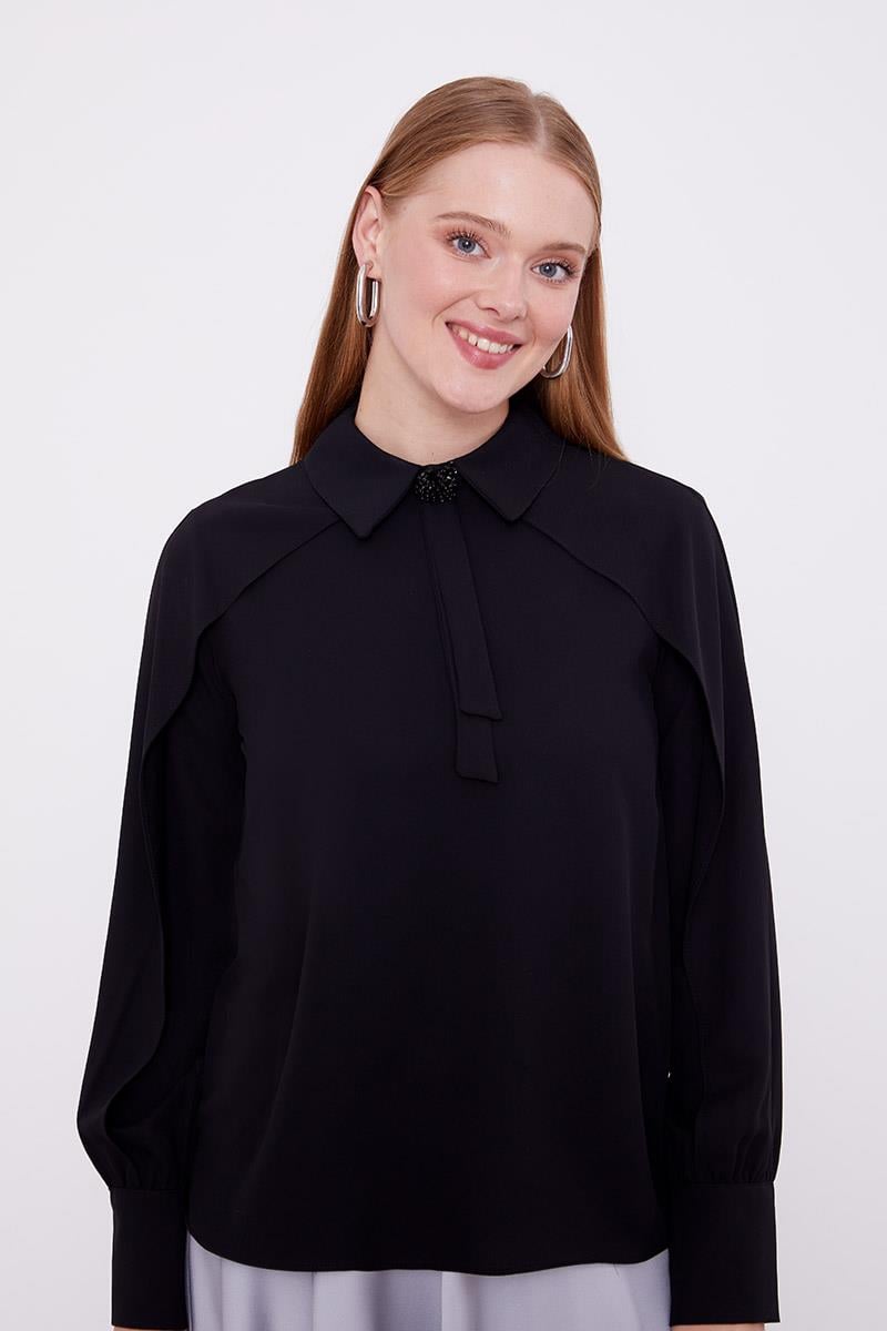 This collar stone detail blouse transforms the comfort of daily wear into elegance with sparkling details. The stone brooch at the collar and cape sleeve detail add a sophisticated touch to the simple appearance.