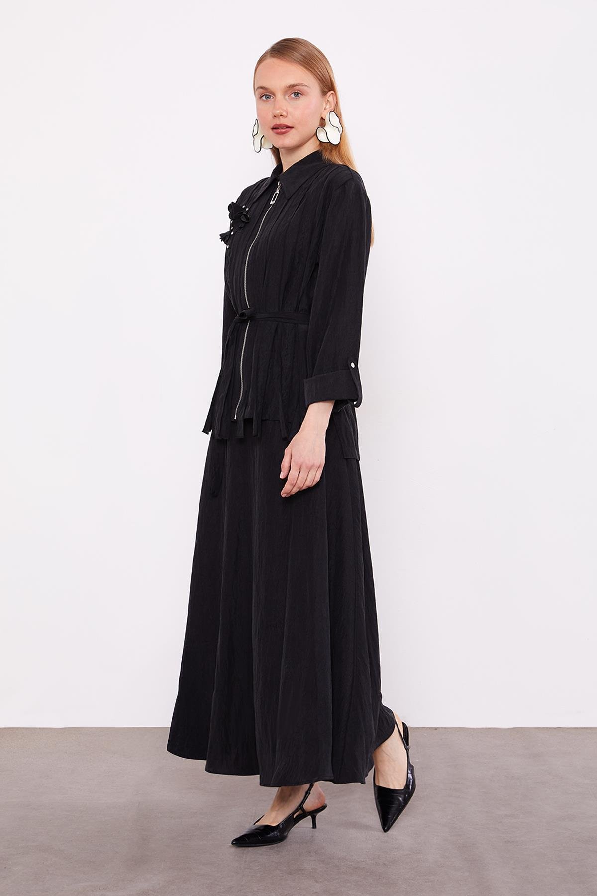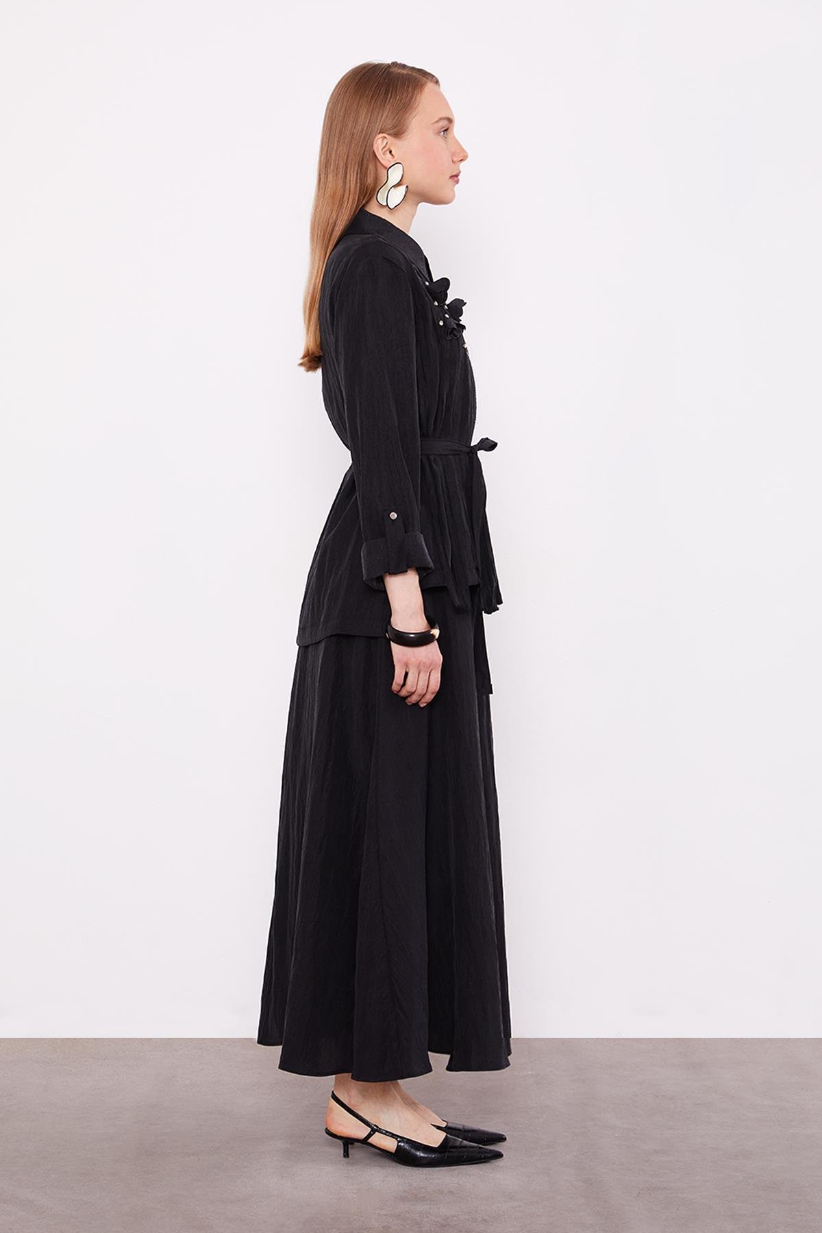 With its comfortable cupra fabric structure, this stone-detailed collared cupra two-piece set offers ease of movement, making it an ideal choice for those who want to maintain elegance without compromising comfort throughout the day. Our two-piece set is designed for effortless wear in your daily life or at special events. Thanks to the floral and stone details on the top piece, it stands out from classic sets, creating a distinctive look.