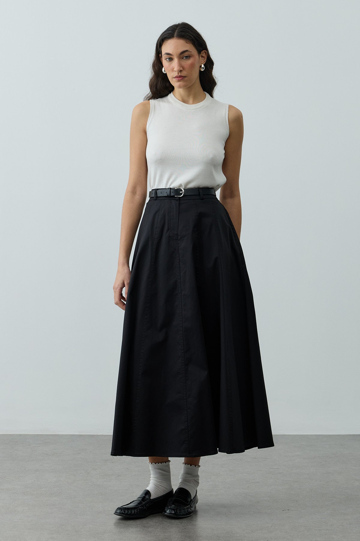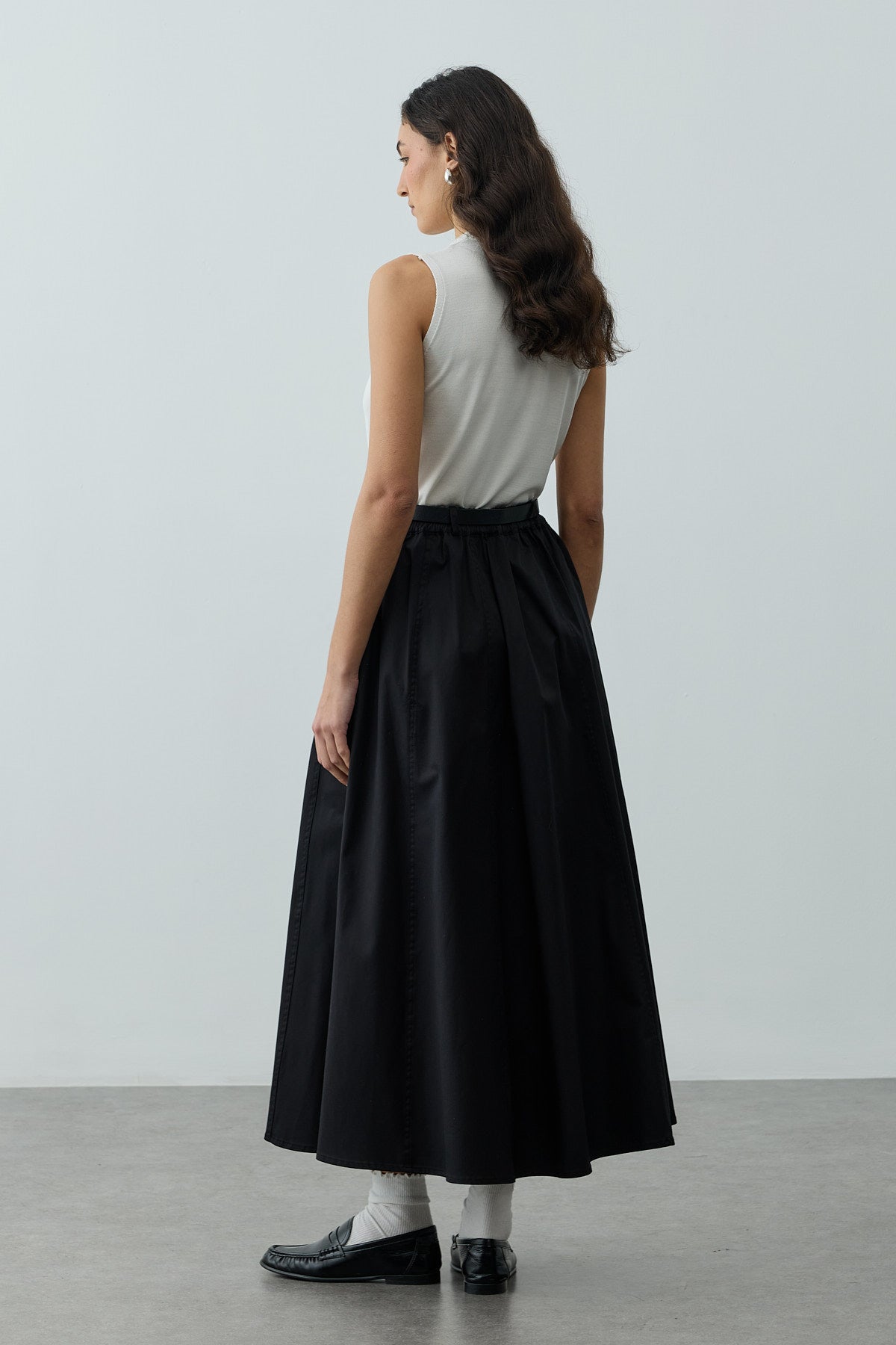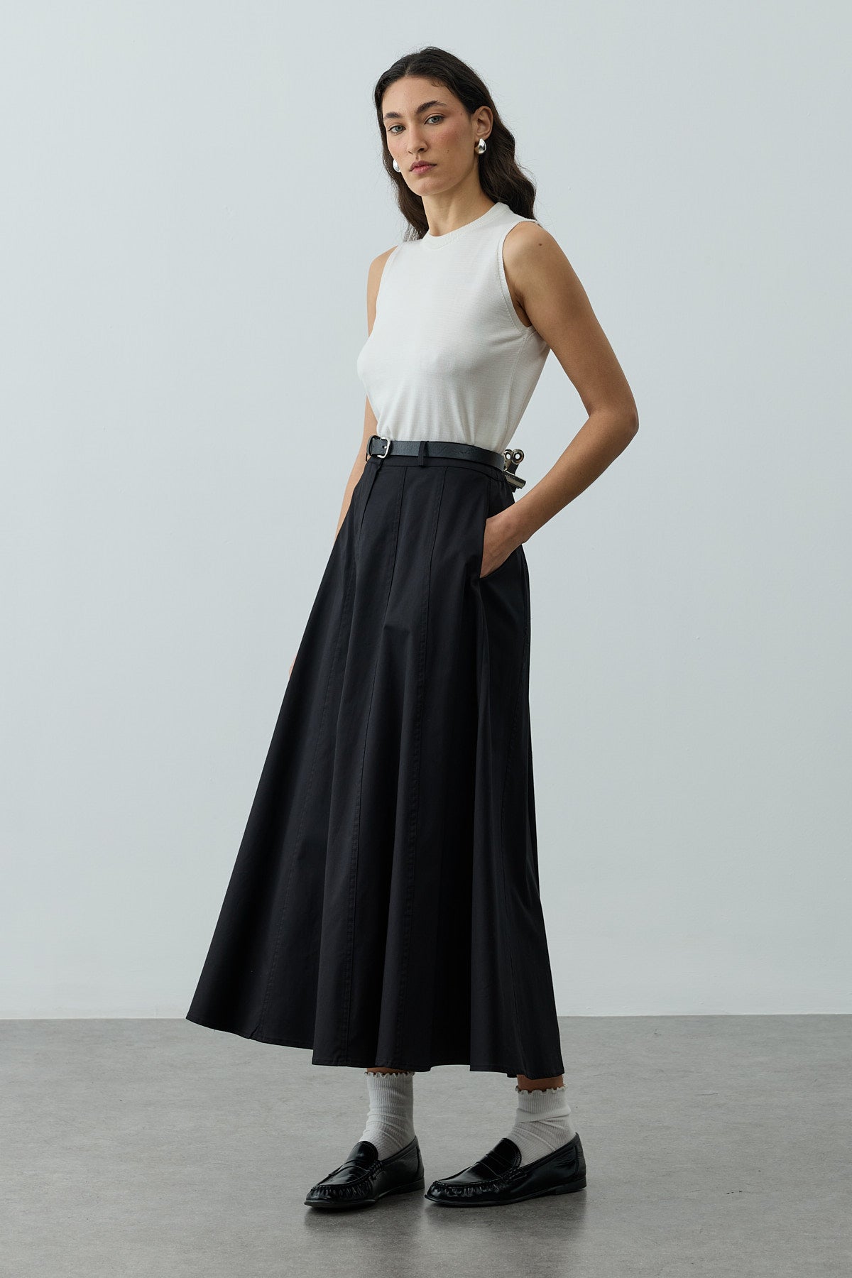 Tags: black skirt, cotton blend, fashion skirt, gabardine skirt, maxi skirt, stitch detail, women's clothing