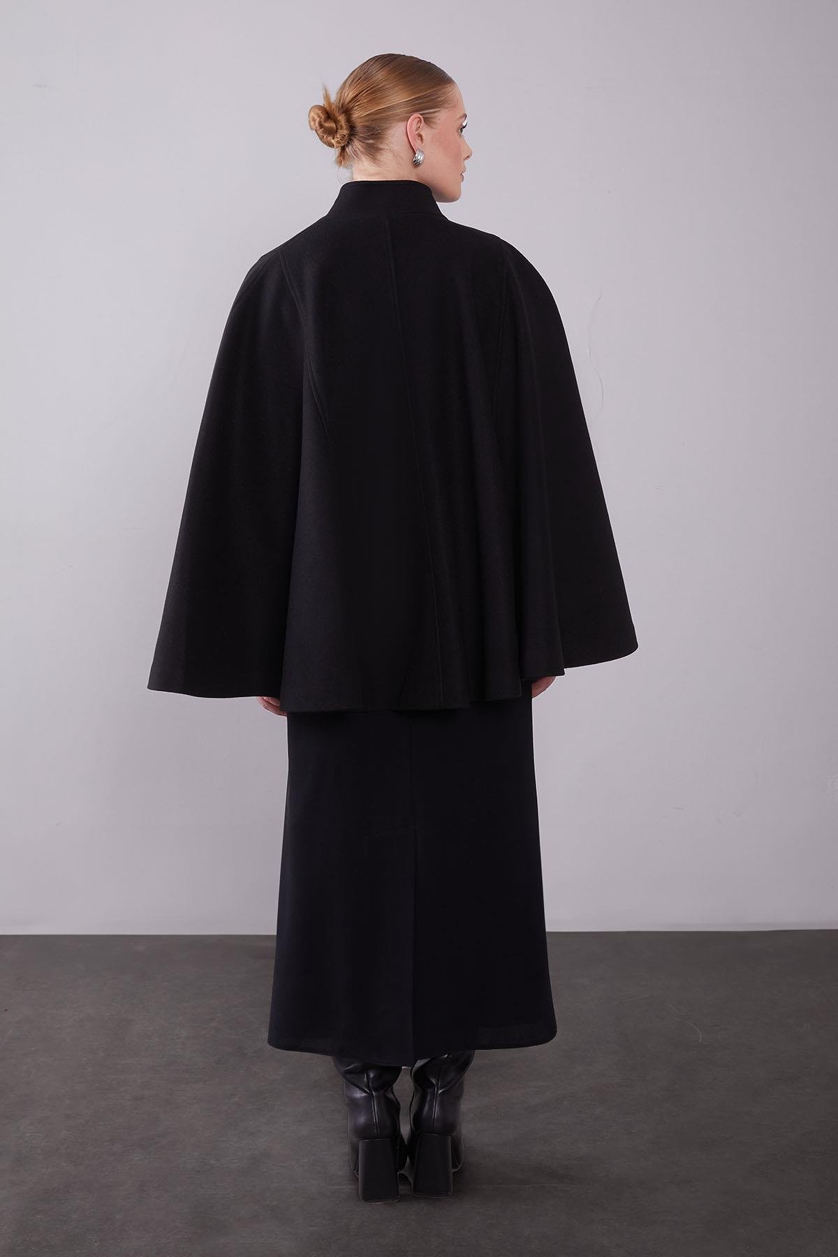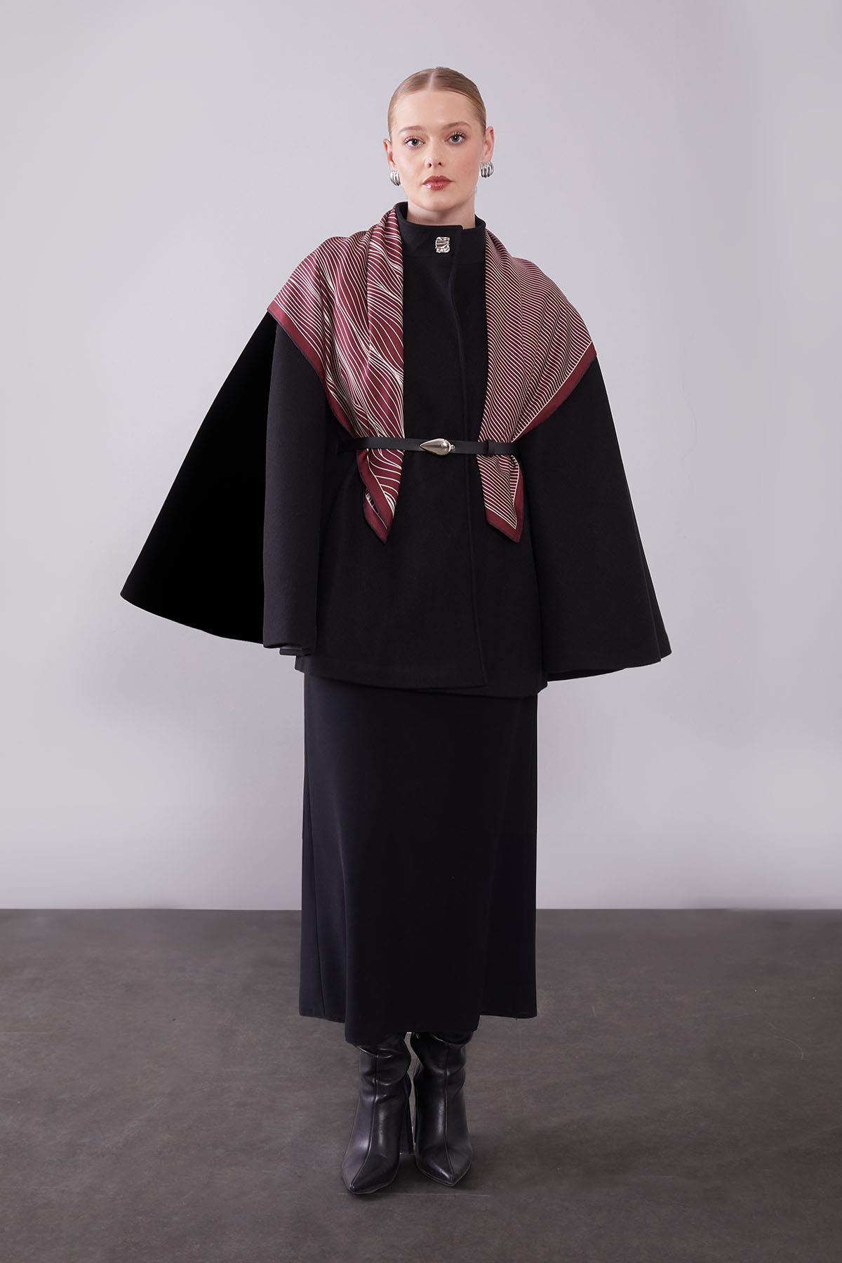This hidden belt detail poncho, with its elegant design and functional structure, brings sophistication to outerwear, creating a striking silhouette in your outfits. The hidden belt detail inside gives the poncho a modern form that fits at the waist, helping you appear slimmer. Thanks to its comfortable cut, it offers a comfortable experience both in daily use and special combinations. Ideal for seasonal transitions, this poncho keeps you warm in cool weather without compromising your style. You can easily pair our new season poncho with pants, dresses, and skirt combinations. With its chic and minimal details, this new poncho stands out as a strong outerwear alternative that complements modern women’s style.