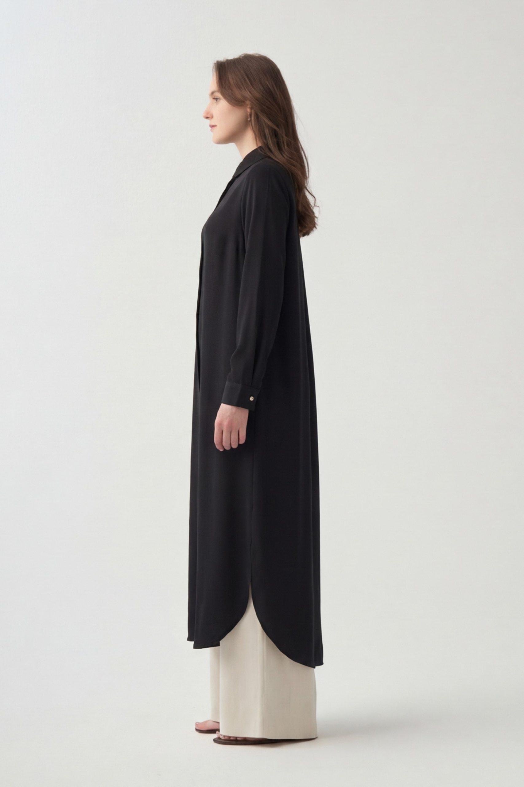 Achieve an elegant look with the Black Hidden Slit Long Shirt, designed for those who seek sophistication in details. Ideal for daily wear and special combinations, available at ALLDAY!