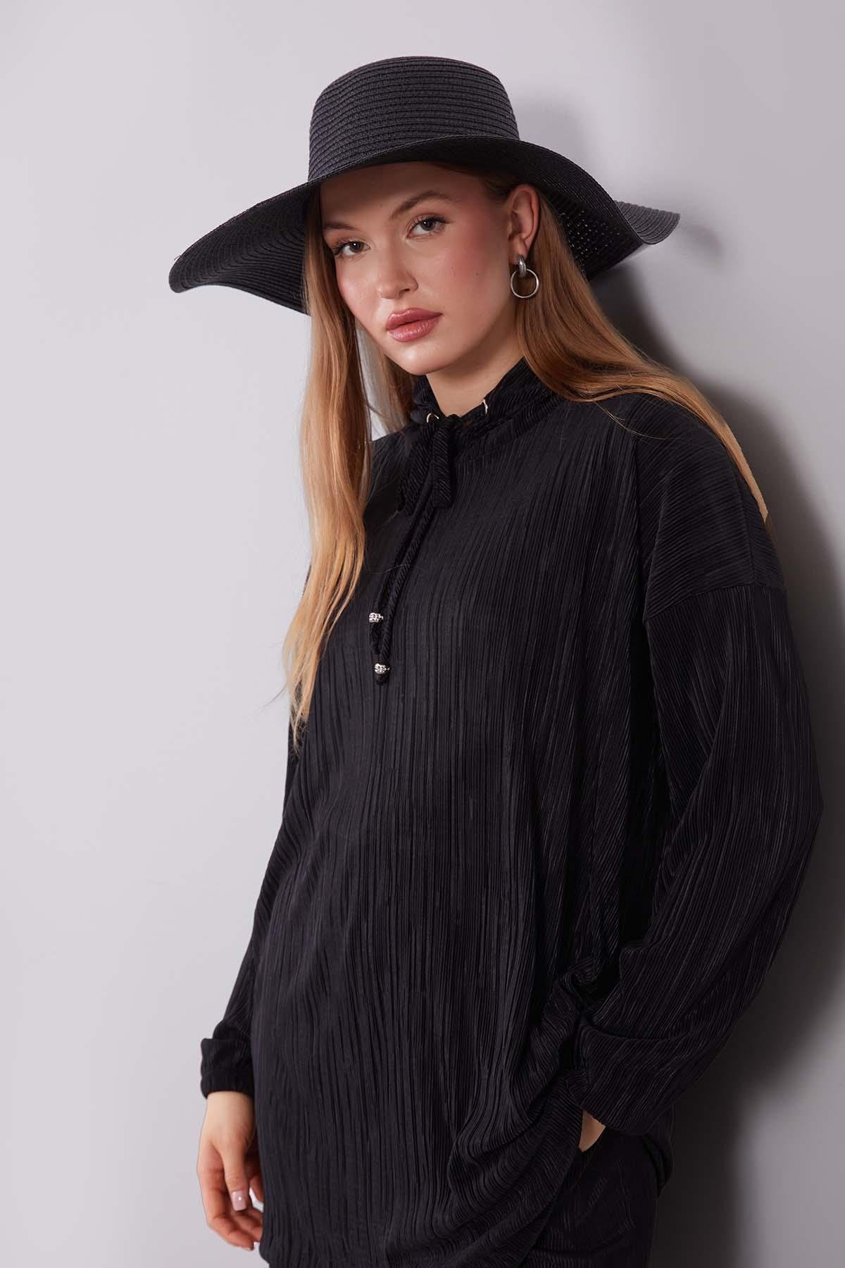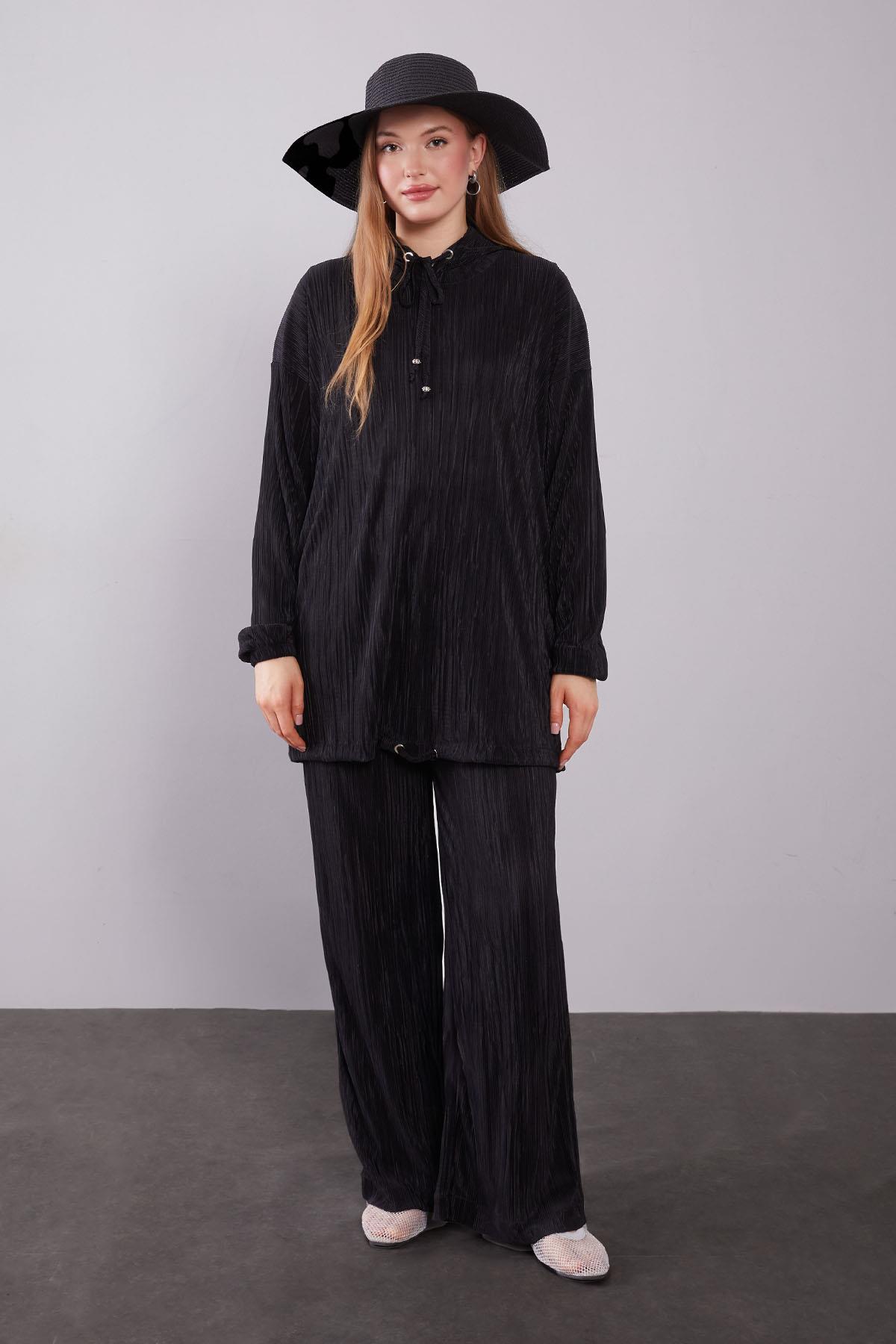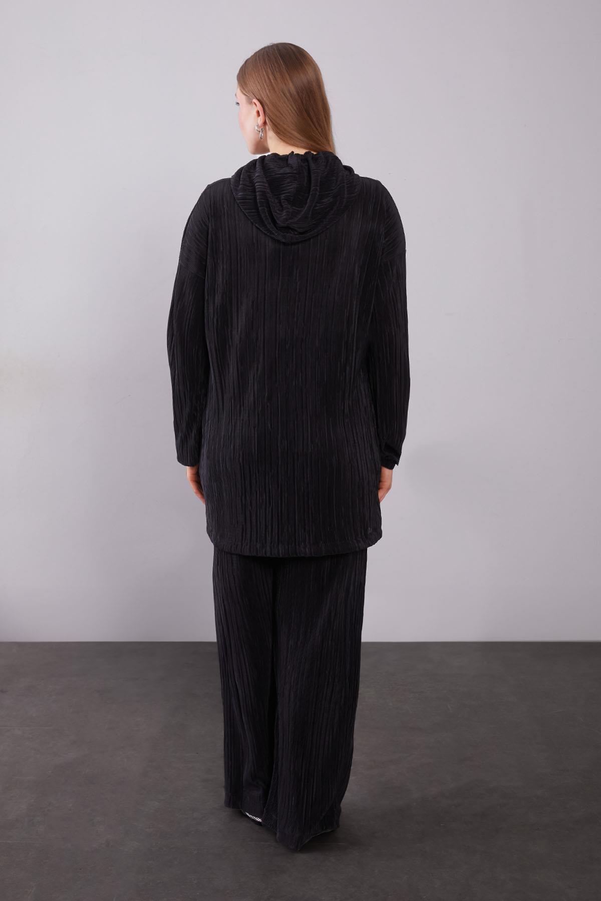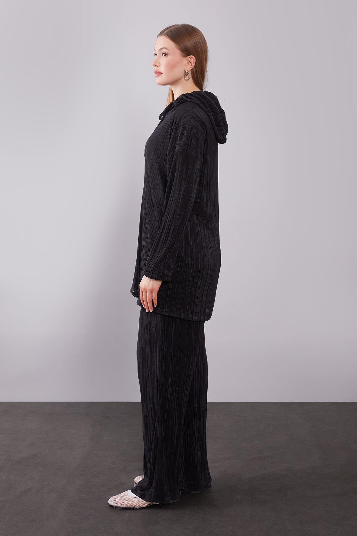 This hooded two-piece set with drawstring detail stands out in daily wear with its modern design that combines comfort and elegance. Its relaxed cut allows for freedom of movement throughout the day, while the hood detail adds a sporty and dynamic look. The adjustable drawstring details provide an aesthetic touch to the set. Thanks to its soft fabric, this two-piece set can be comfortably worn in all seasons, becoming an essential in any setting. The harmonious design of the top and bottom pieces eliminates the hassle of coordinating, offering practical use. Designed for those who love sporty elegance, this set can be easily worn for daily walks or weekend activities.