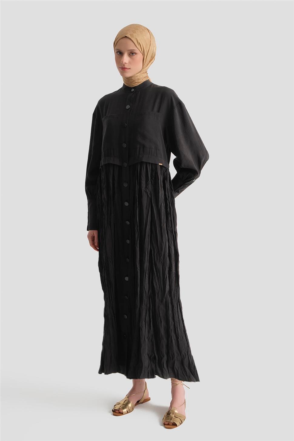 This dress combines modern elegance with a unique touch through its fluid modal fabric and natural crinkle-effect surface. Its simple silhouette is enhanced by sophisticated character, while the button closure design and comfortable cut ensure all-day wearability. The dynamic texture adds graceful movement to your figure, offering versatile style from daily urban looks to elegant evening combinations.