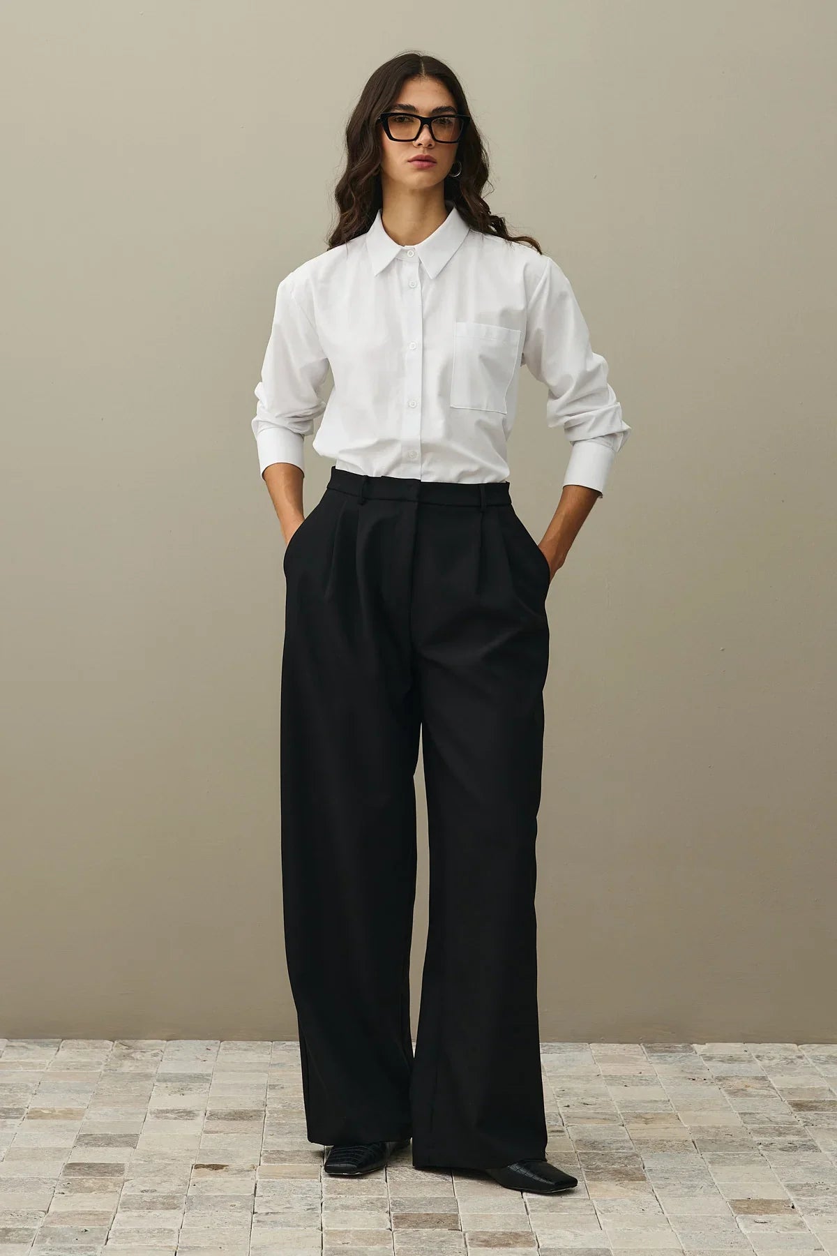 Tags: black trousers, draped pants, high-waist pants, palazzo trousers, women's fashion