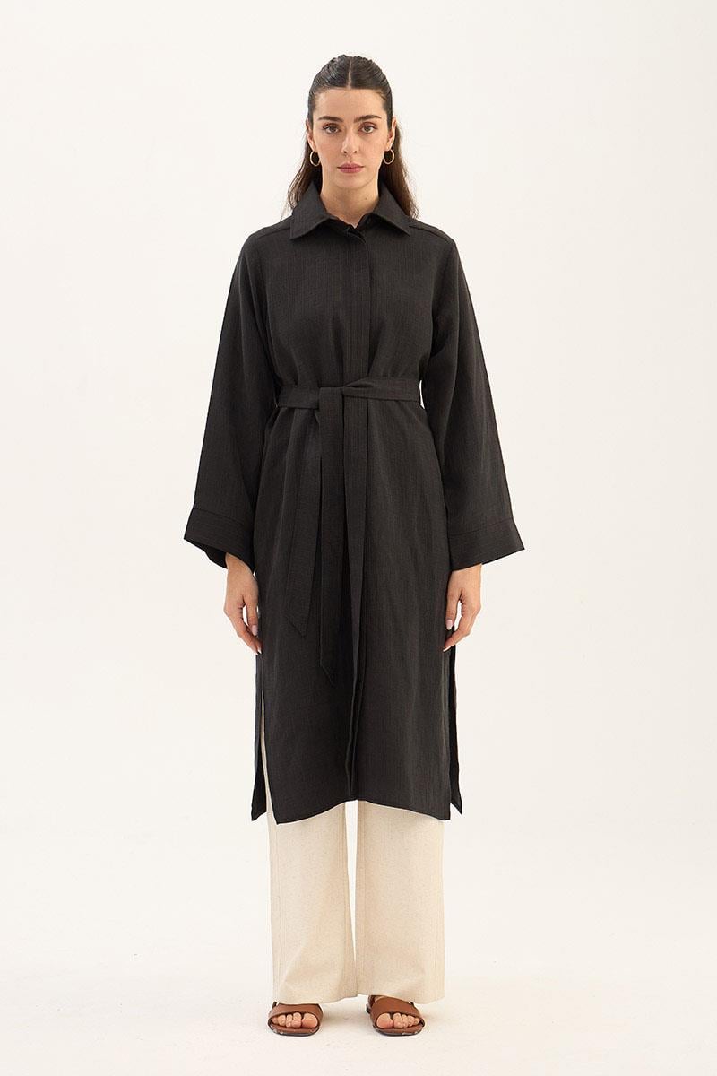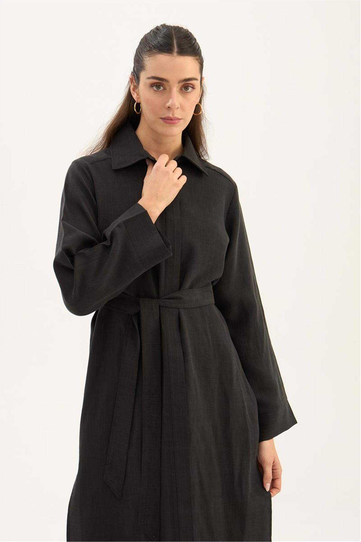 This black long tunic, featuring natural texture and elegant stripes, is one of the fresh and stylish pieces for the summer season. Made from an 88% Tencel and 12% Pes blend fabric, it offers lightness and softness while its breathable structure ensures comfort in warm weather. Its fine striped weave provides a modern look, and the self-fabric belt detail at the waist creates a form-fitting silhouette.