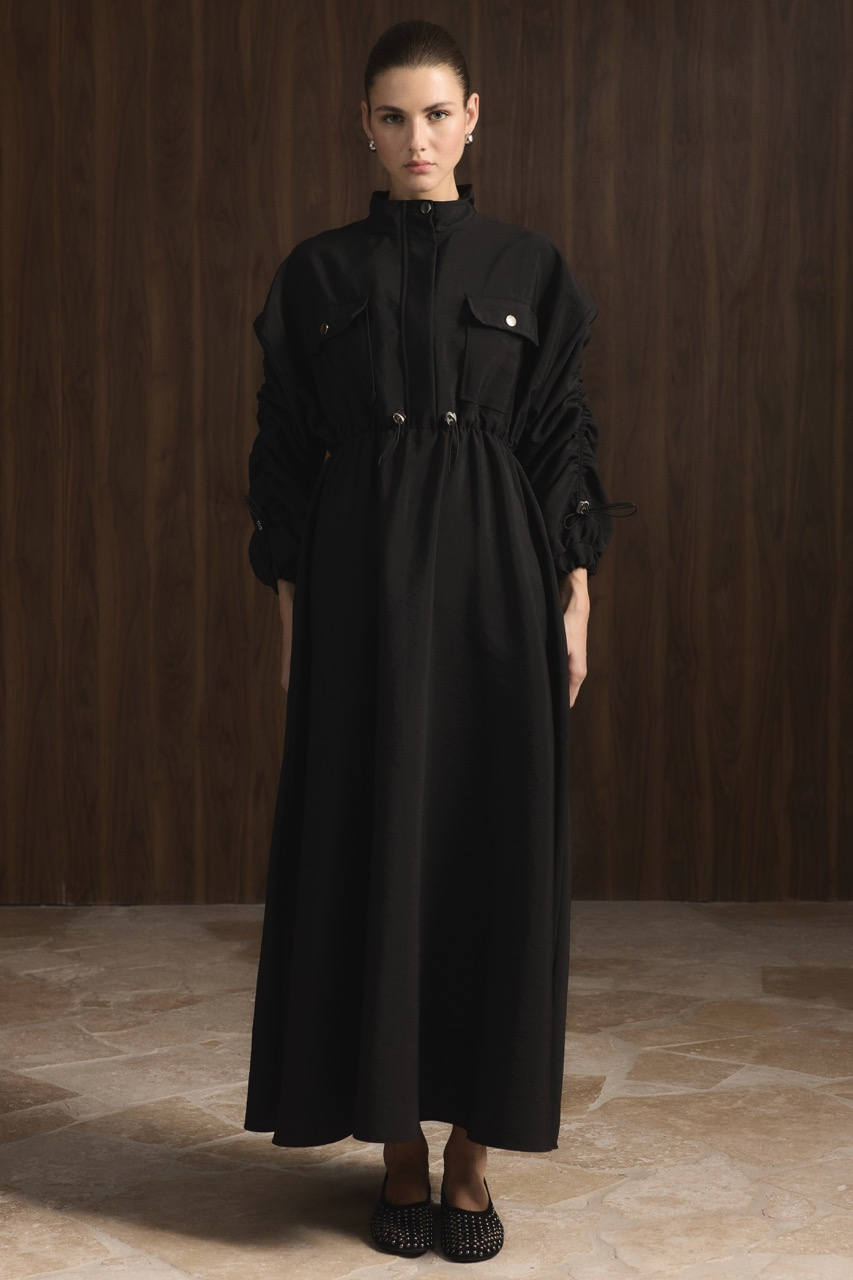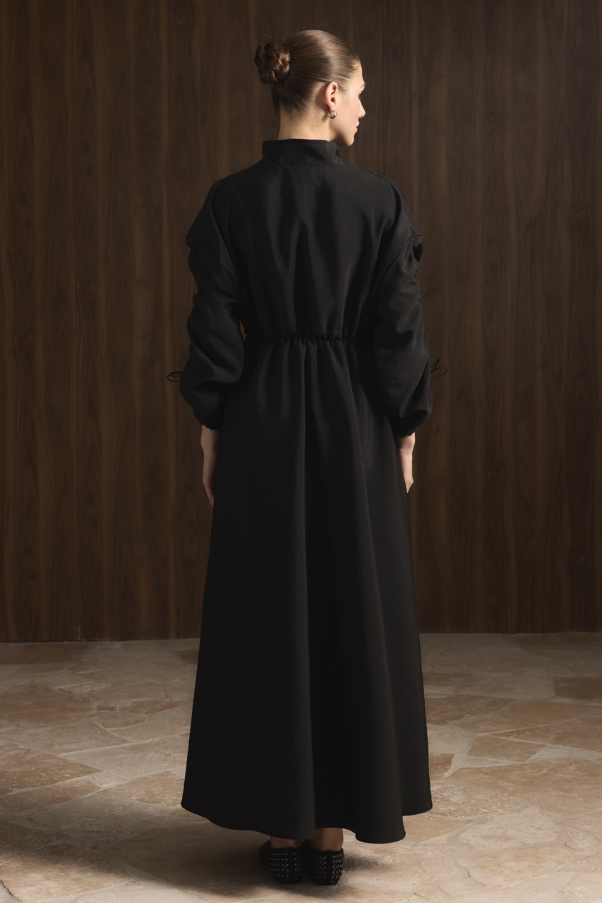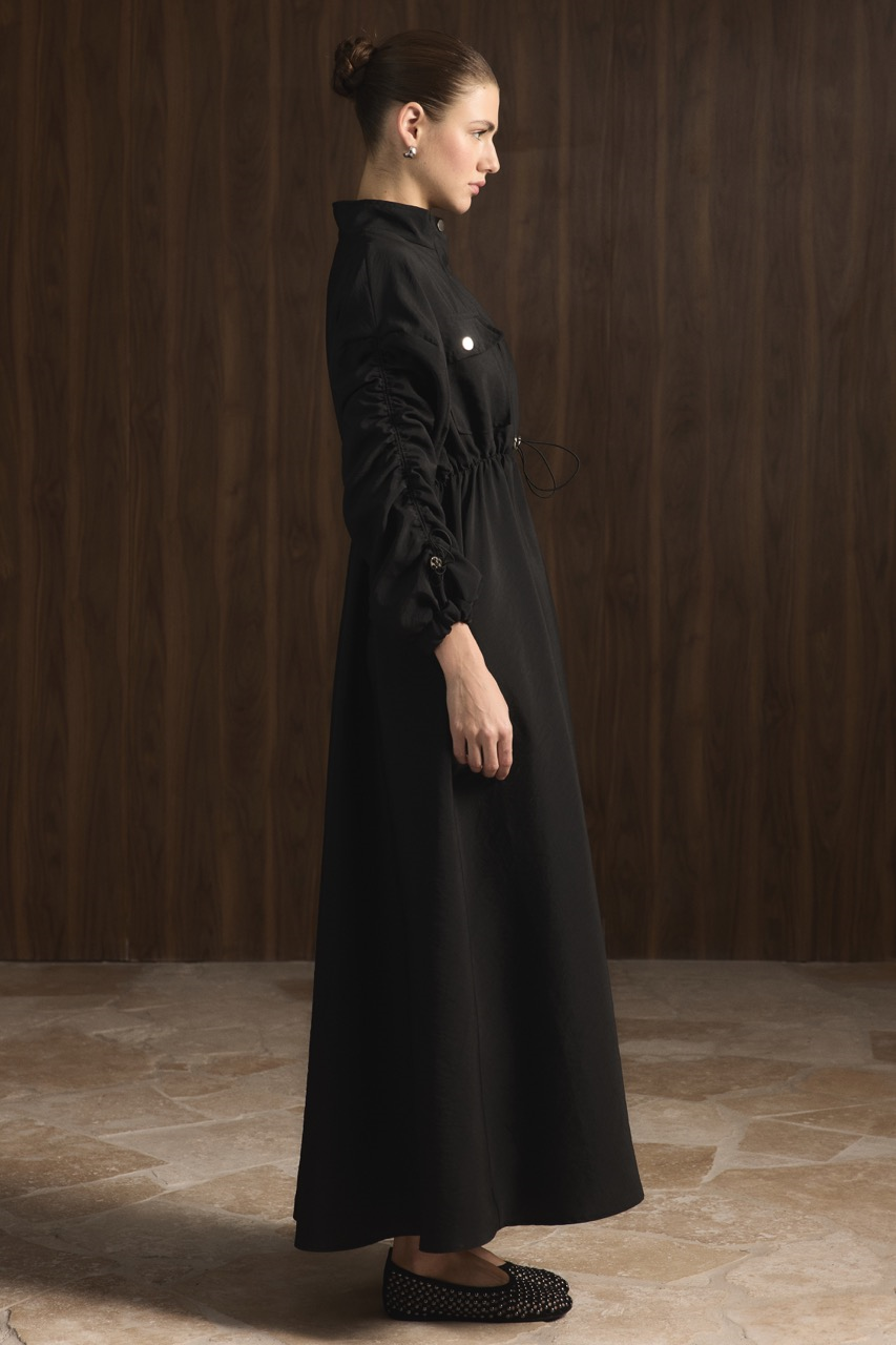 Black Tunnel-Waist Detail Dress with Double Pockets