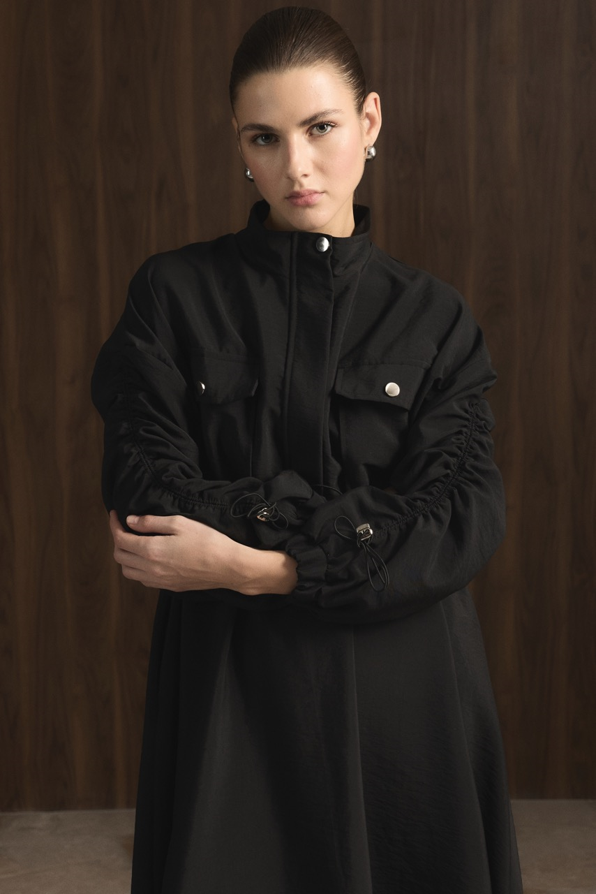This cupra dress stands out with its fluid texture and modern details, offering comfortable and elegant wear. The tunnel detail at the waist elegantly accentuates body contours, while the double pocket design adds functionality to the style. The elastic details at the sleeve ends and the gathered slit design bring movement to the dress. Featuring a hidden zipper detail for a clean and minimalist look, this dress provides versatile styling options from casual chic to urban ensembles with its flowing silhouette and relaxed fit.