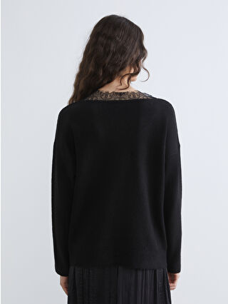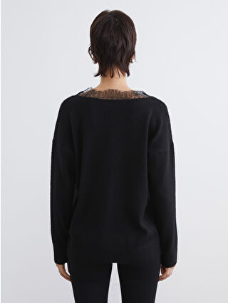 Black V-Neck Lace Detail Oversize Women’s Knit Sweater