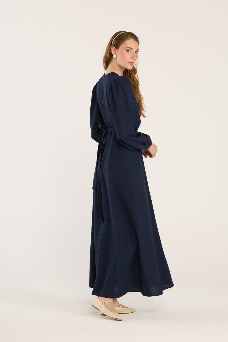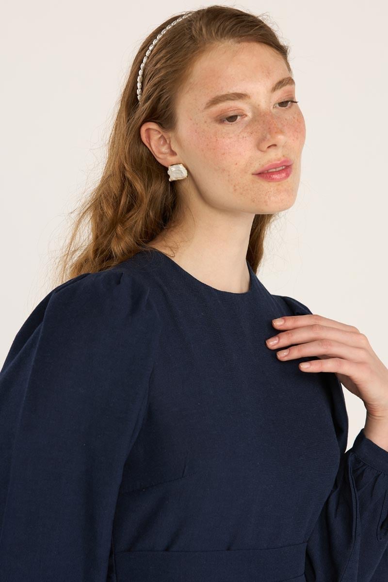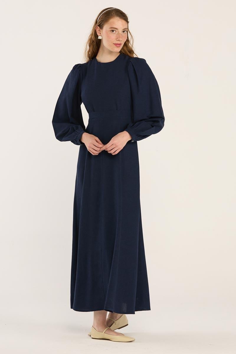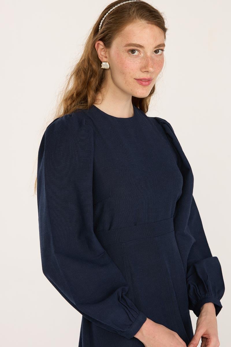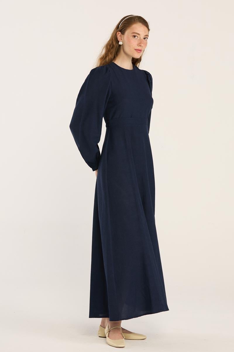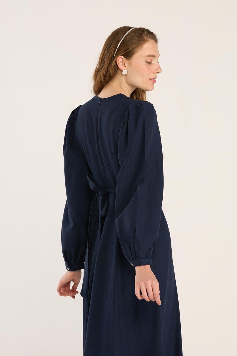Kemerli Keten Elbise Lacivert