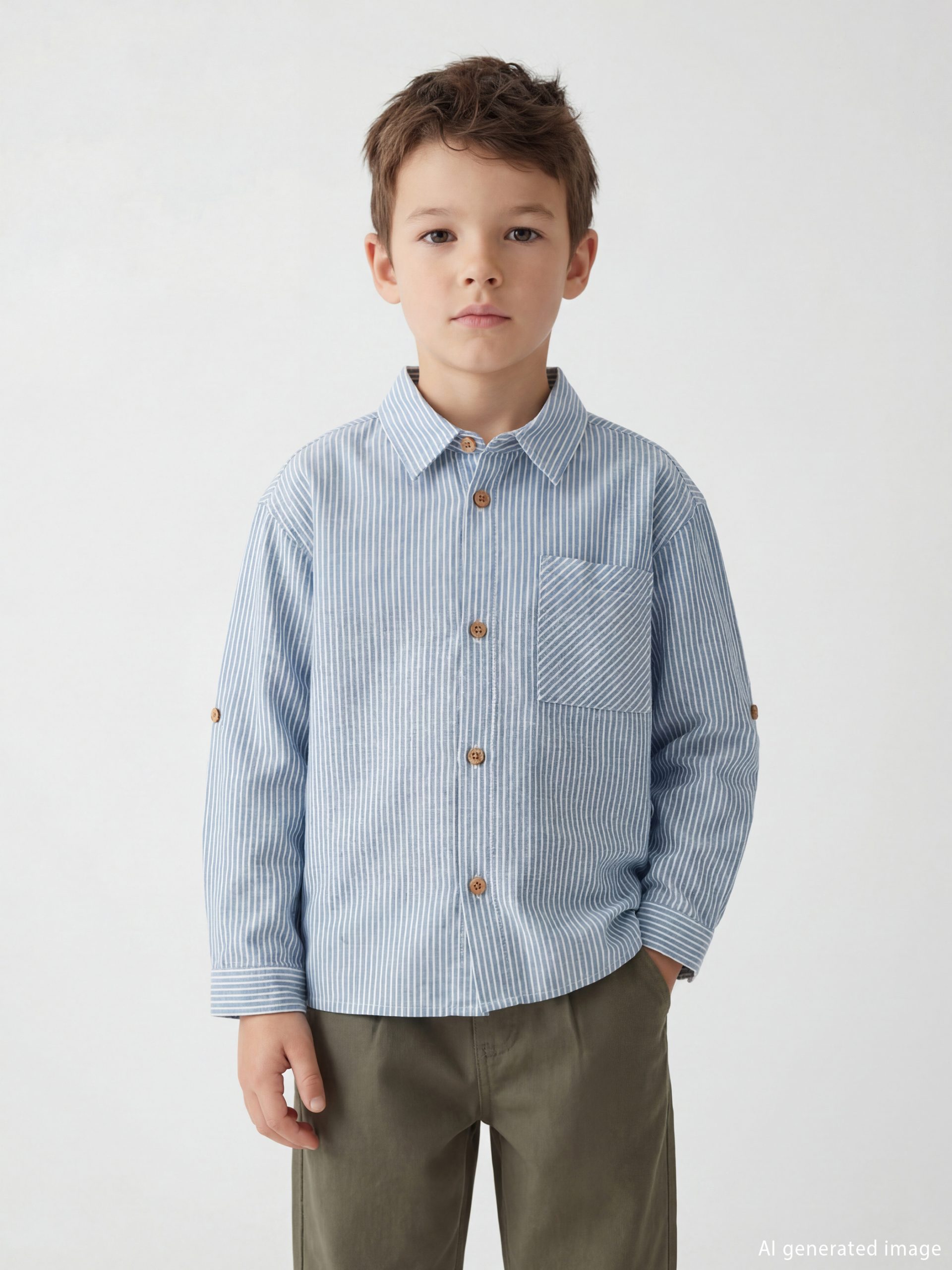 Tags: boys shirt, button-down shirt, casual wear, kids fashion, linen blend, long sleeve, loose fit, striped shirt