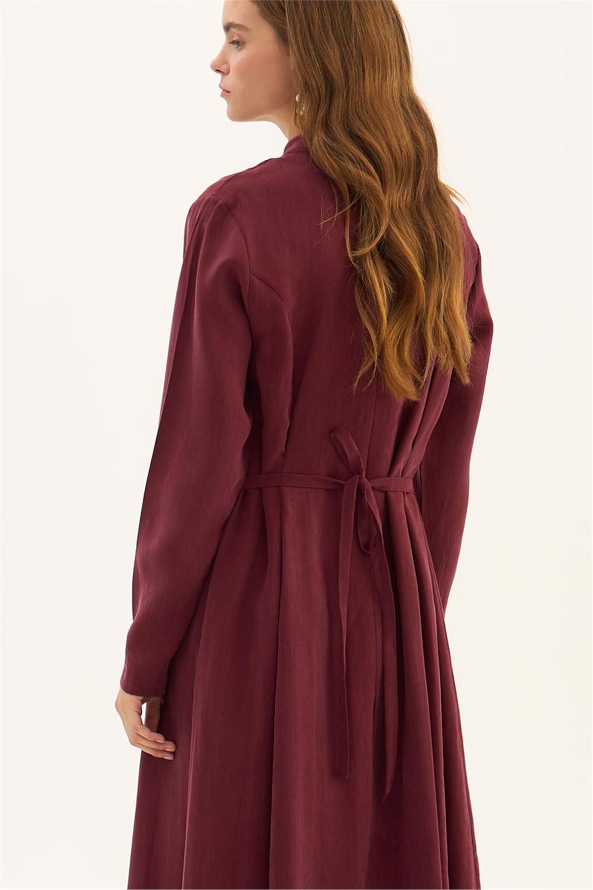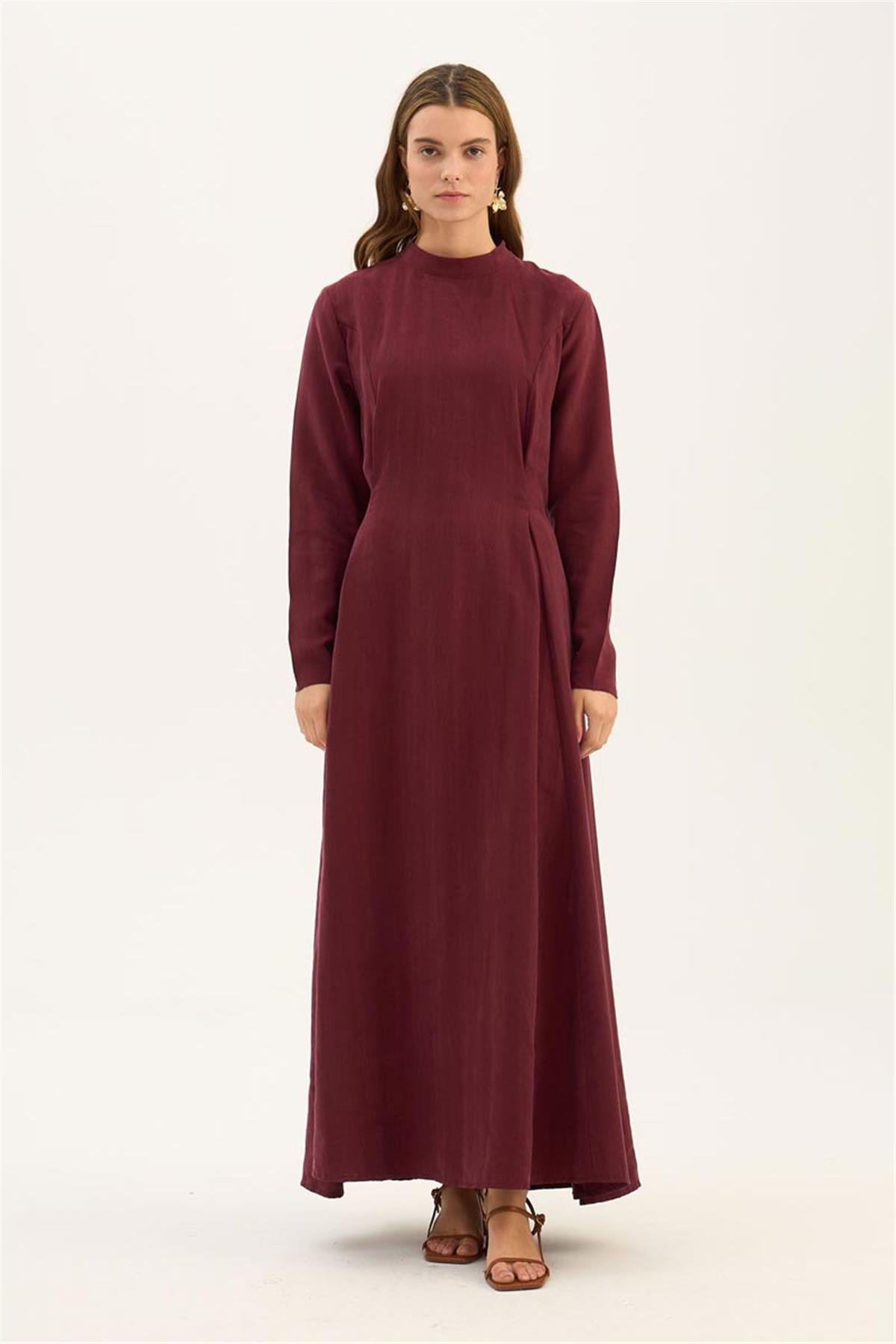 This Bordeaux dress prioritizes comfort in summer months with its soft texture and lightweight structure. Thanks to its natural Tencel fabric, it breathes well and provides a cooling sensation on the skin. The brushed texture gives it both an elegant and modern appearance, while its long form creates a graceful silhouette on the body. With its minimalist design, this timeless piece offers all-day comfort and freedom of movement. This dress stands out stylishly on its own and can be paired with various combinations, from flats to sandals. Offering a wide range of uses from special occasions to daily wear, this design is poised to become a staple in your summer wardrobe. The Bordeaux color harmonizes with both pastel and vibrant tones, adding an elegant touch to your style.