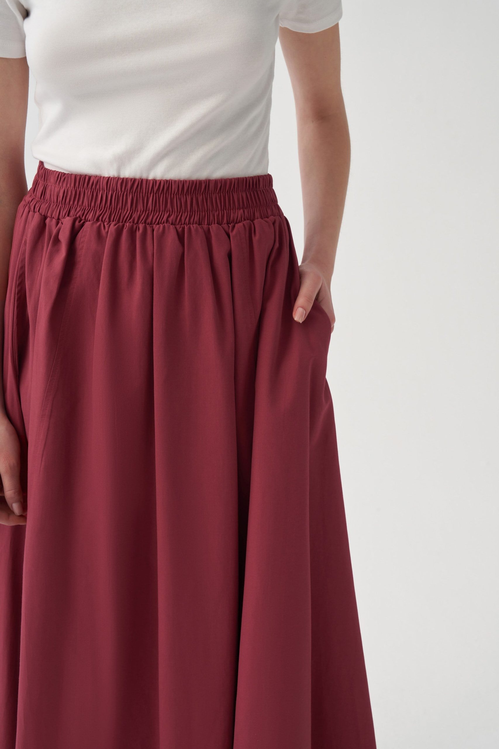 Şıklığı detaylarda arayanlara özel Bordo-Poplin Etek ile zarif bir görünüm yakalayın. Günlük ve özel kombinler için ideal tasarım