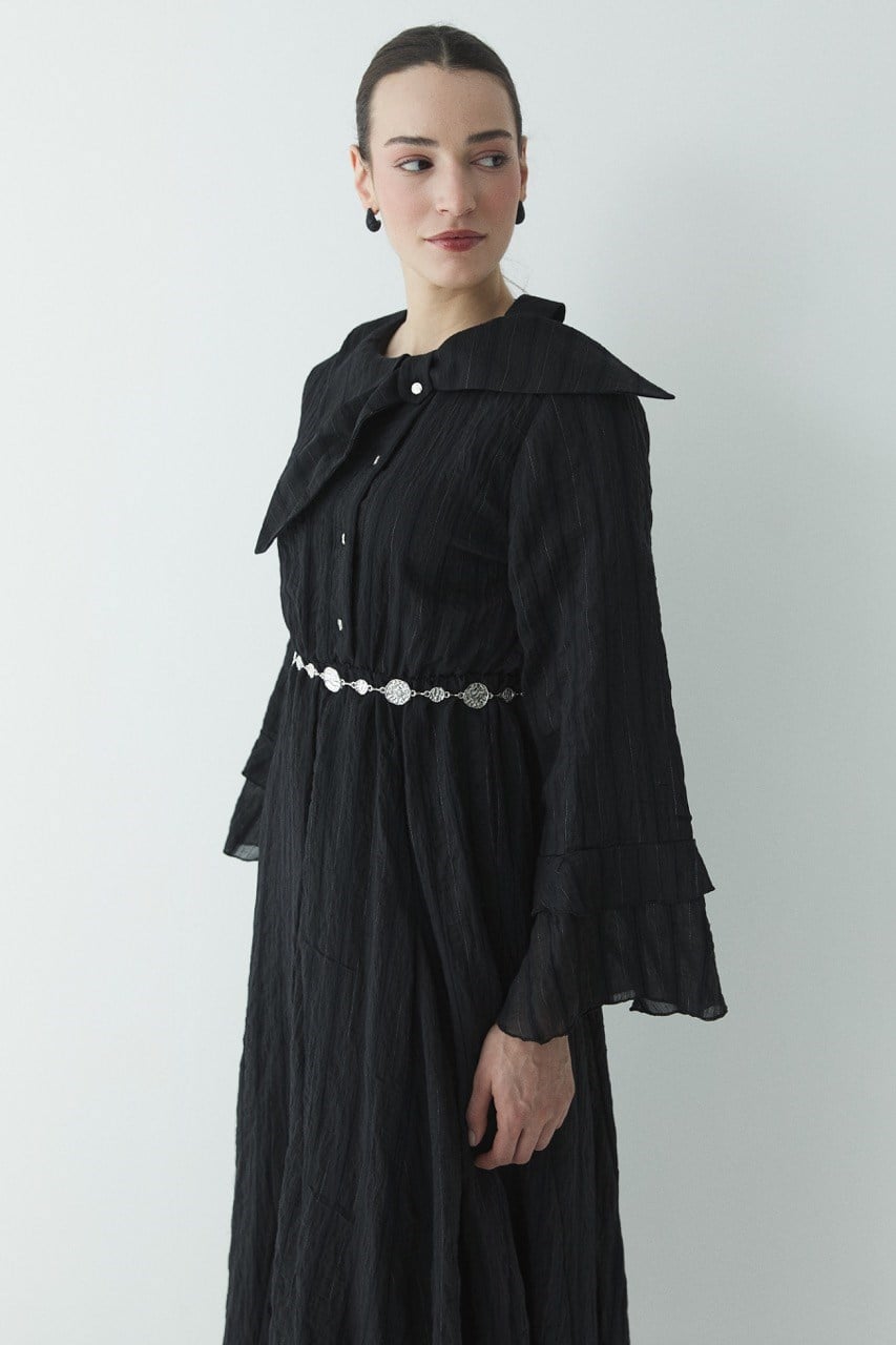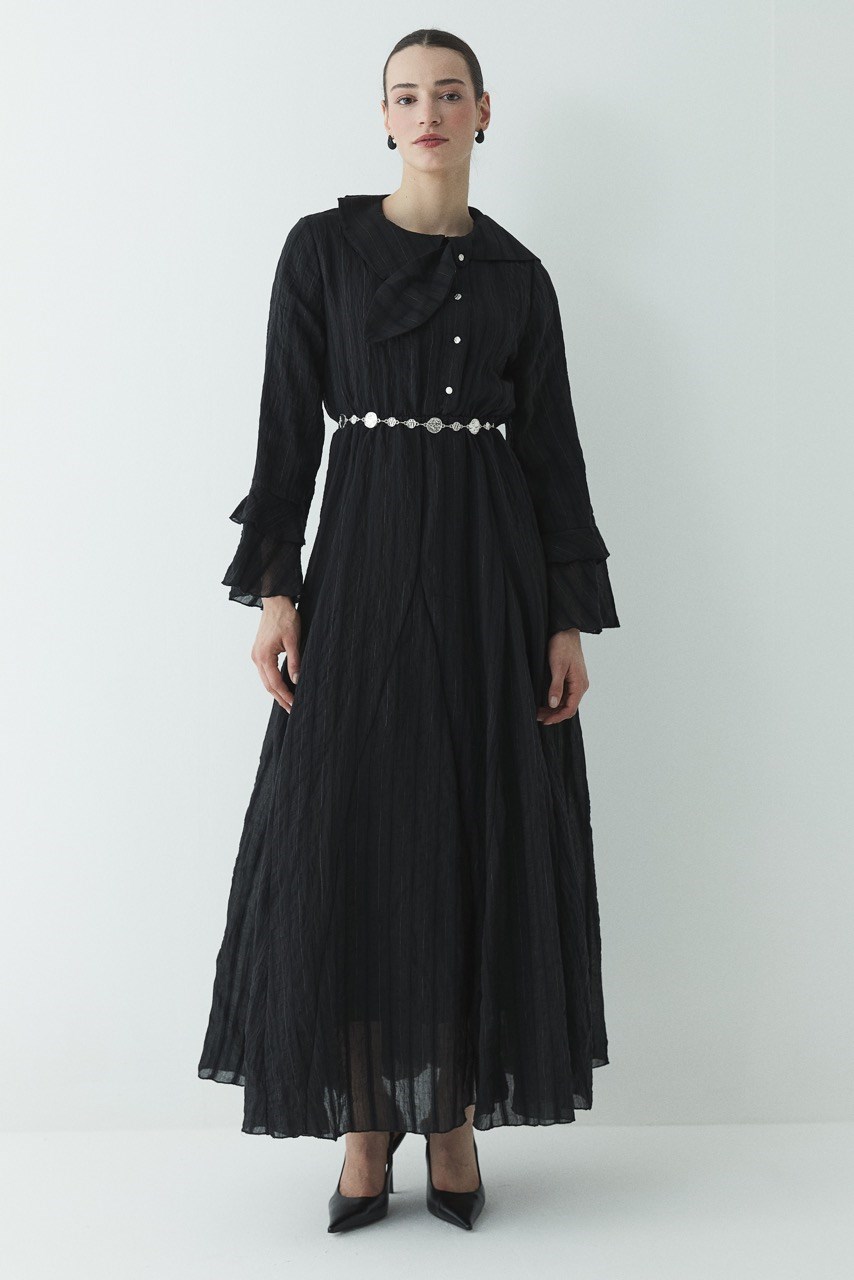 This dress embodies timeless elegance in its most graceful form, offering a feminine silhouette with its lightweight texture and fluid shape. The button details on the front and soft tie-neck collar add a romantic touch to the design, while the delicate accessory detail at the waist completes the look. Thanks to its layered and slightly transparent texture, it can be comfortably worn both for special occasions and stylish daily combinations.