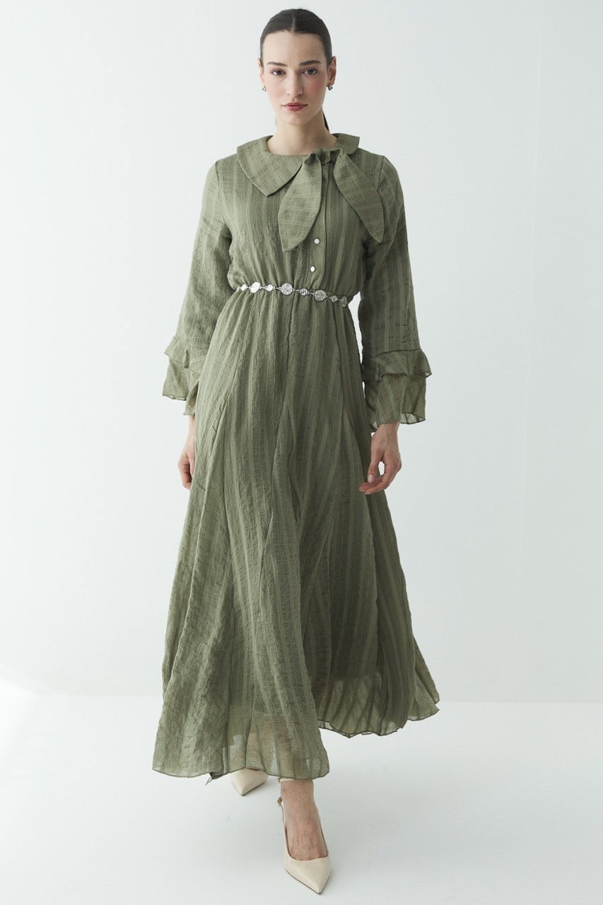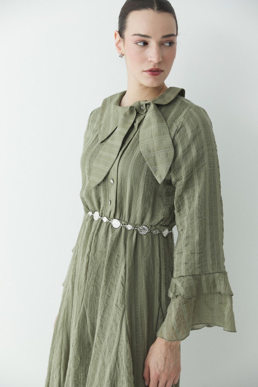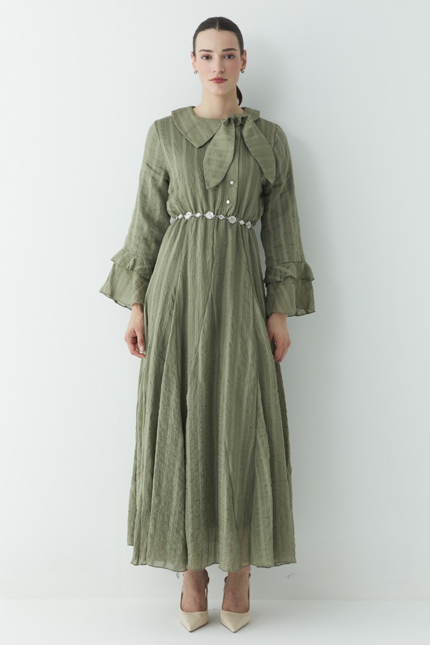 This dress embodies timeless elegance in its most graceful form, offering a feminine silhouette with its light texture and flowing shape. The button details on the front and the softly formed tie neckline add a romantic touch to the design, while the subtle accessory detail at the waist completes the look. Thanks to its layered and slightly transparent texture, it can be comfortably chosen for both special invitations and stylish daily combinations.
