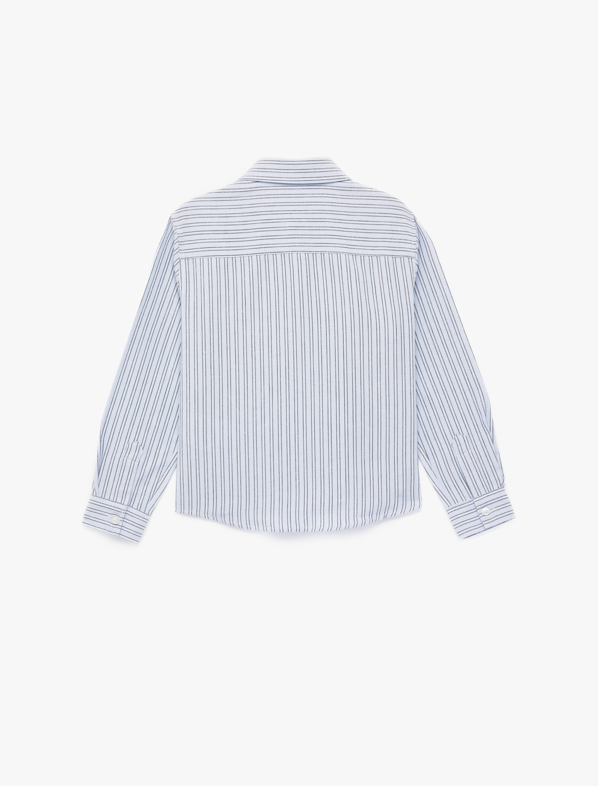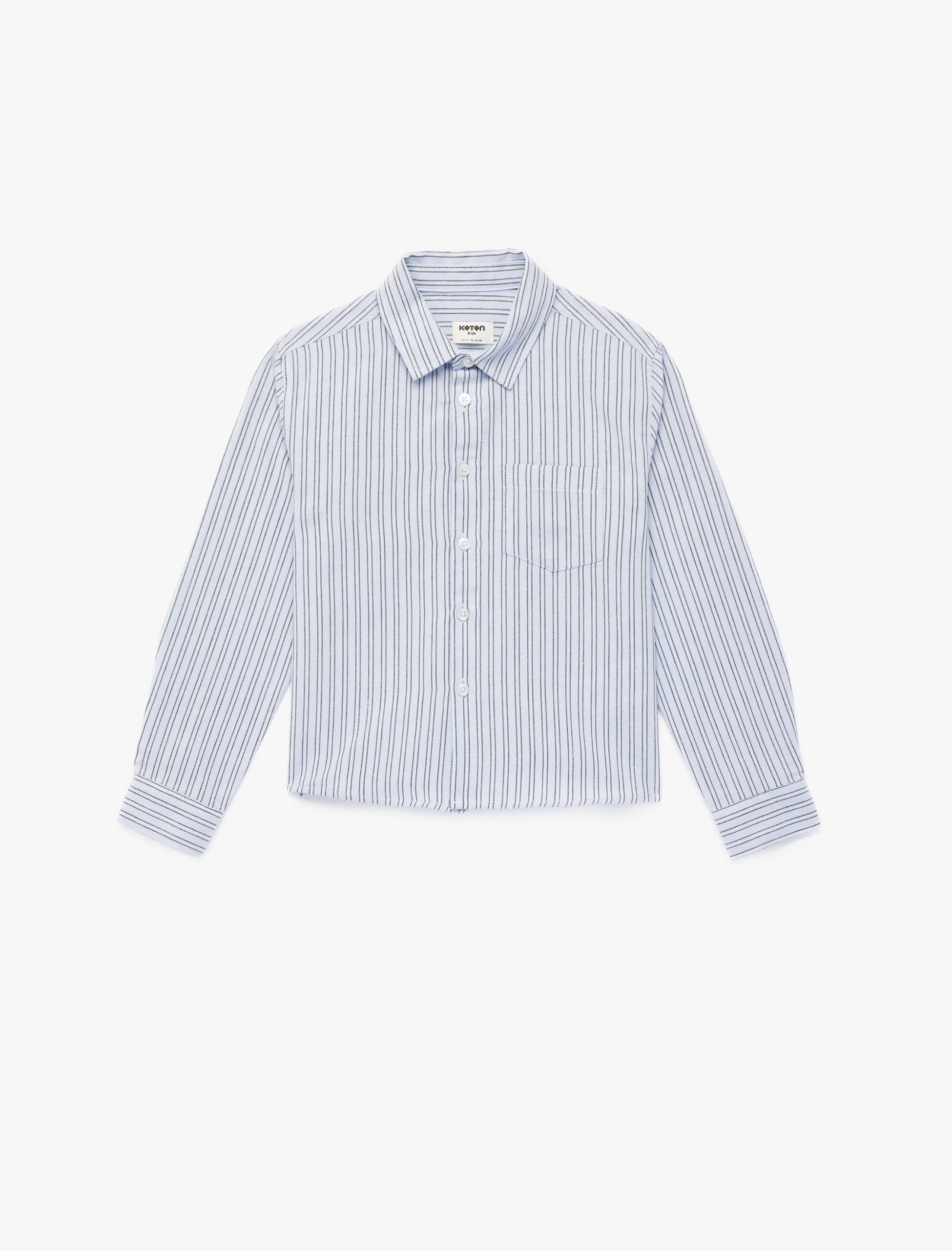 This striped shirt offers a comfortable and stylish option for children. Its button-down design allows for easy wear and removal, while the single pocket detail stands out with its practical use. With its standard length and soft texture, it pairs well with any outfit. Made from 100% cotton, it provides comfort and serves as an ideal complementary piece.