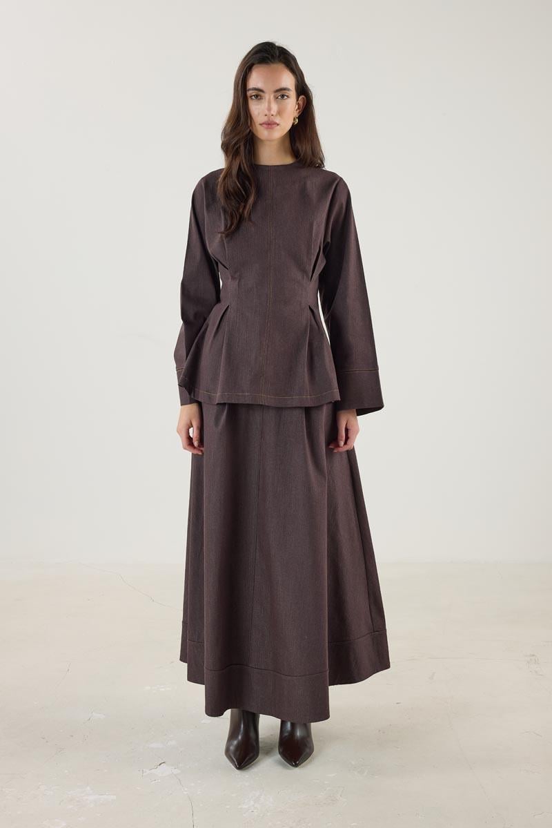Tags: brown blouse, crew neck, denim blouse, long sleeve, pile detail, women's blouse