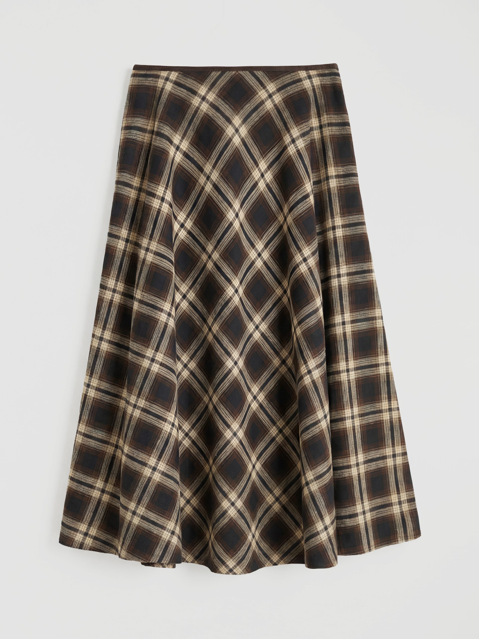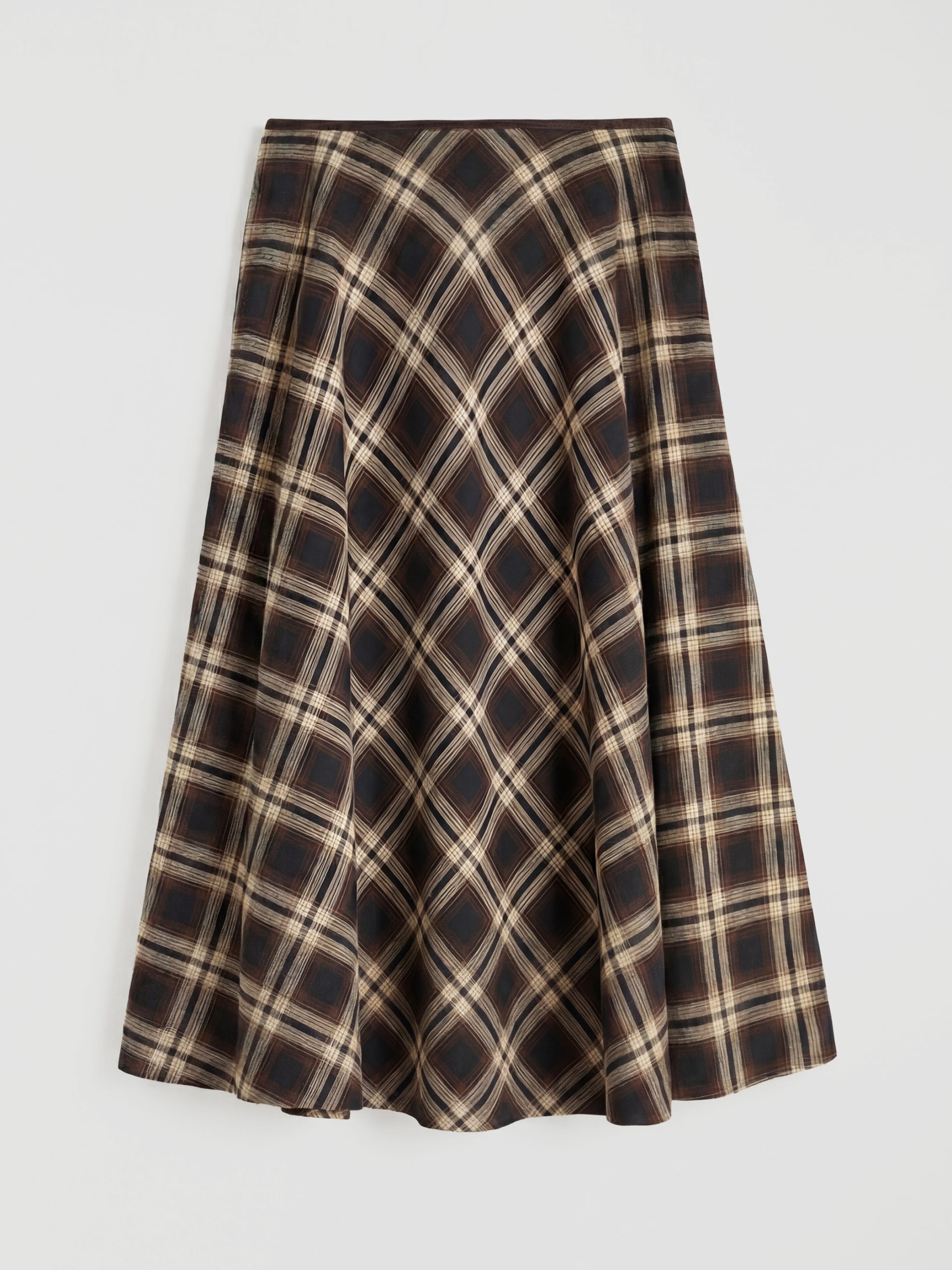 Tags: A-line skirt, brown skirt, casual wear, cotton skirt, midi skirt, plaid skirt, women's skirt, zipper skirt