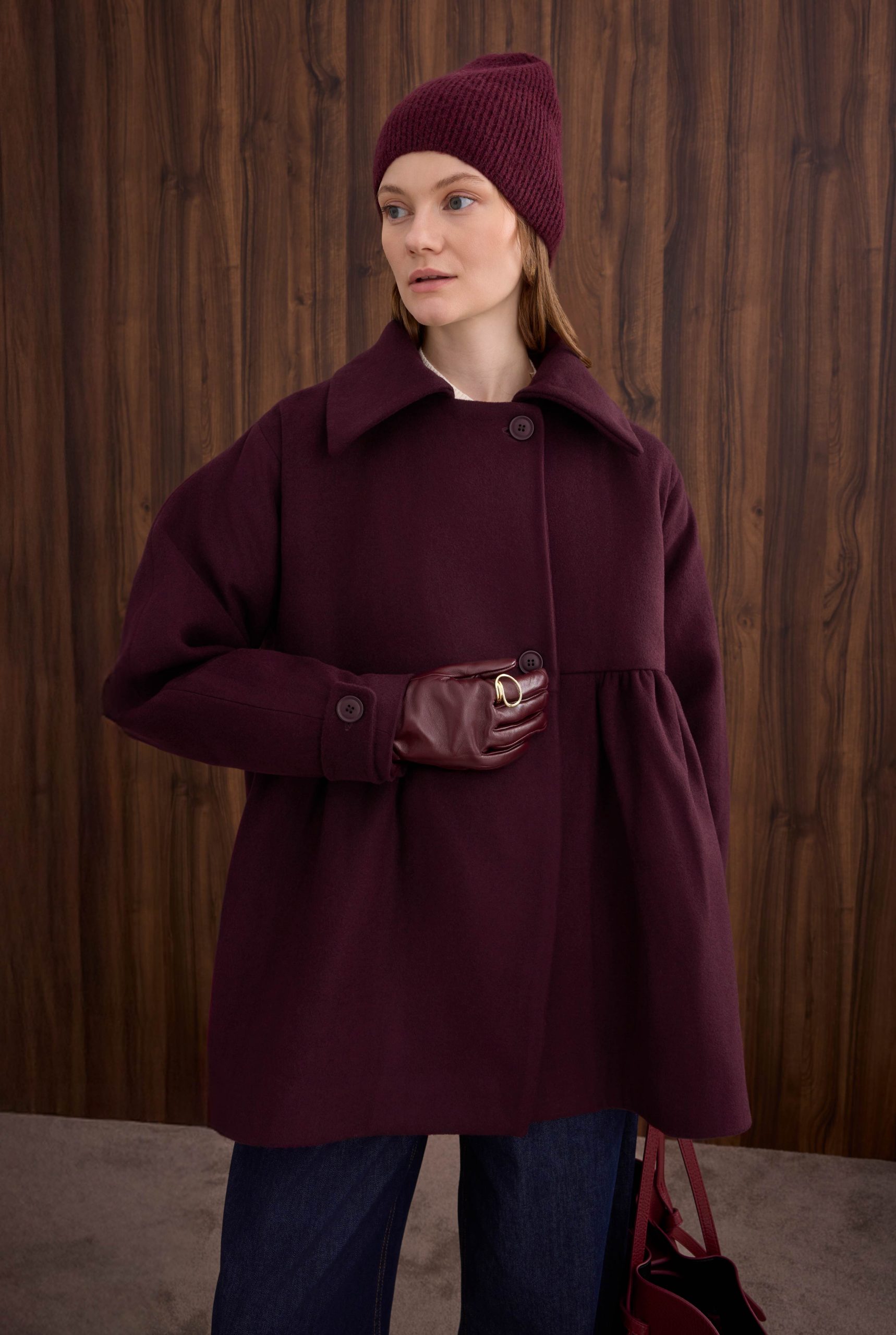 Crafted from 100% acrylic yarn, this coat offers lightweight warmth and comfortable wear in cold weather. The soft texture and firm structure of acrylic fabric give the product both a voluminous form and long-lasting durability. With its modern and charming silhouette, this model gains movement through gather details while providing comfort for daily use. It combines both elegance and comfort in your outerwear outfits. Fit Information: Features a relaxed fit; we recommend choosing your usual size. Care Instructions: Wash at 30°C with similar colors. Do not use bleach. Iron at low temperature. Length: 76 cm (Product length may vary by 1-5 cm between productions). Size Information: Chest Sleeve Length Biceps Size 1: 116 cm 60 cm 46 cm Size 2: 120 cm 60 cm 46.5 cm Model Measurements: Height: 175 cm Bust: 81 cm Waist: 60 cm Hips: 89 cm Model’s Wearing Size: 1