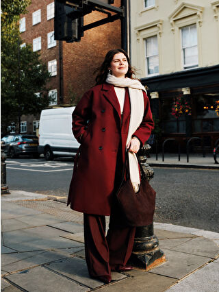 Tags: burgundy coat, loose fit, mid-length coat, notched collar, outerwear, winter coat, women's coat, wool blend coat