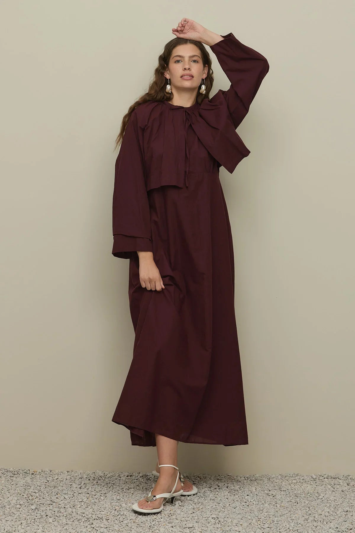 Made from 100% cotton veil fabric, this set features a crop jacket with tie-front closure and wide sleeves, paired with a thick-strapped dress with a zippered back.