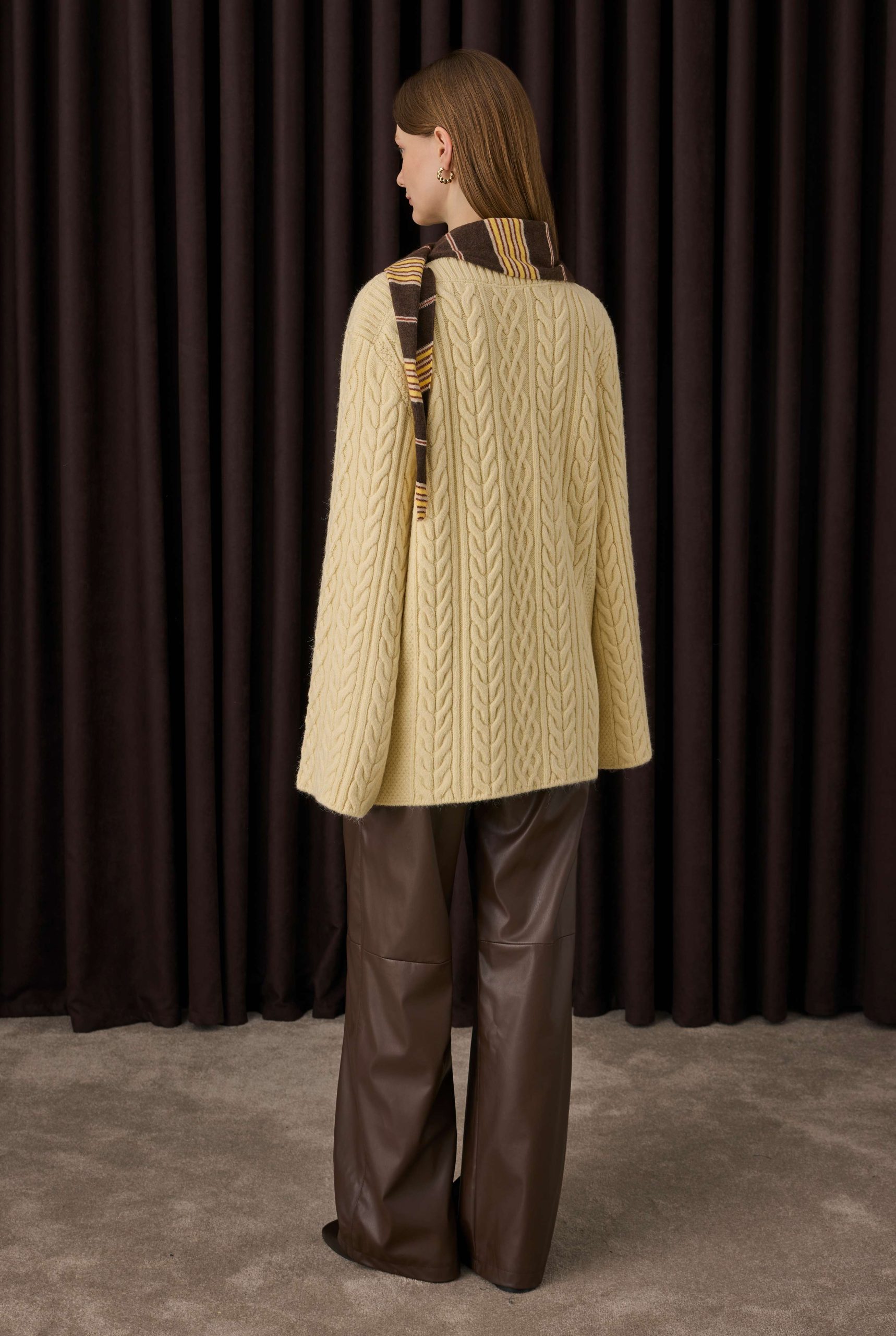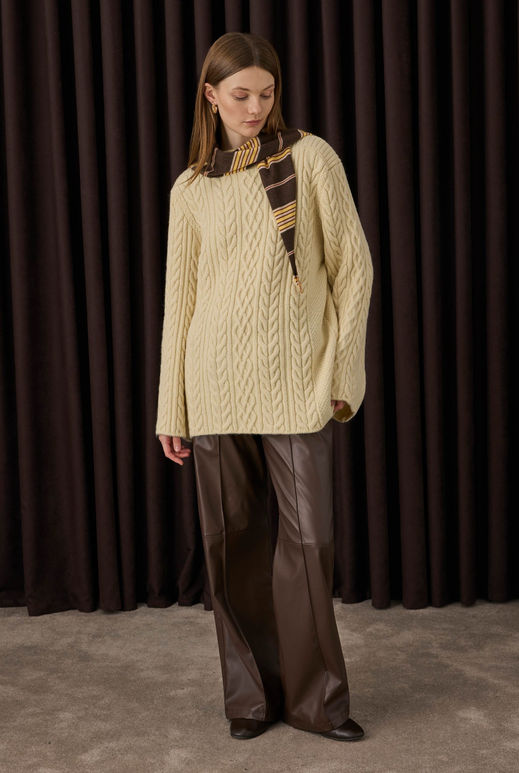 Knit from 79% acrylic and 21% polyester yarns, this sweater offers both comfort and durability. Acrylic yarn provides lightweight warmth and daily comfort, while polyester yarn ensures shape retention, durability, and a structured drape. This balanced blend results in a soft touch and long-lasting quality.