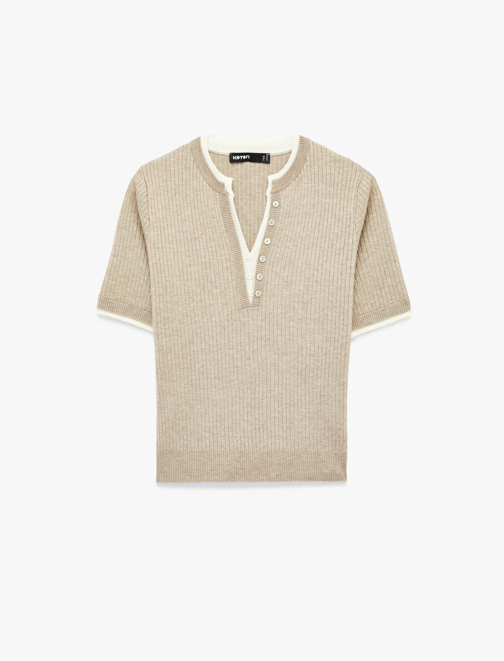 This sweater is poised to become an indispensable part of your wardrobe, blending elegance and comfort with its thoughtful details. Its short-sleeve design and double collar cut make it ideal for warmer weather. Enhanced with button details, it combines classic and modern touches. Thanks to its viscose content, it offers a soft feel and all-day comfort. Perfect for both casual outfits and special occasions, this sweater will be a versatile staple in your closet. Styling Suggestion: This knit sweater is an excellent choice for both casual and chic looks. It pairs effortlessly with trousers and midi skirts, making it a favorite for your everyday style. Complete the look with sneakers or heels for a comfortable yet elegant appearance. Layer it under a blazer for office wear, or pair it with jeans and a casual jacket for a stylish weekend outfit. Product Features: Sleeve Type: Short Sleeve Collar Type: Double Collar Detail: Buttoned Fit: Regular Fit Fabric: 27% Polyester, 22% Polyamide, 51% Viscose Usage: Casual Wear, Office Wear, Special Occasions Discover elegance with Koton’s knit sweater collection! Complete your style with Koton designs today!