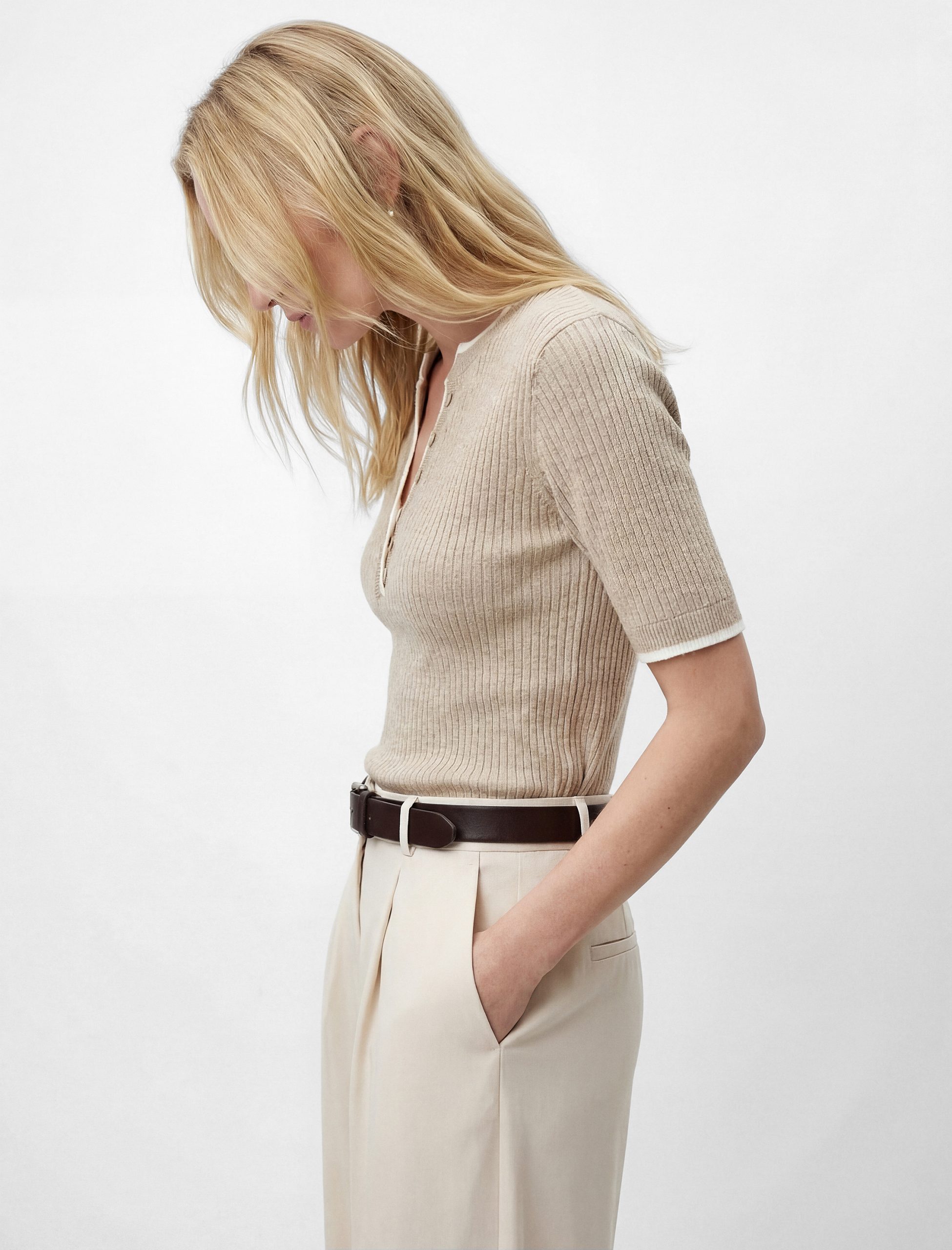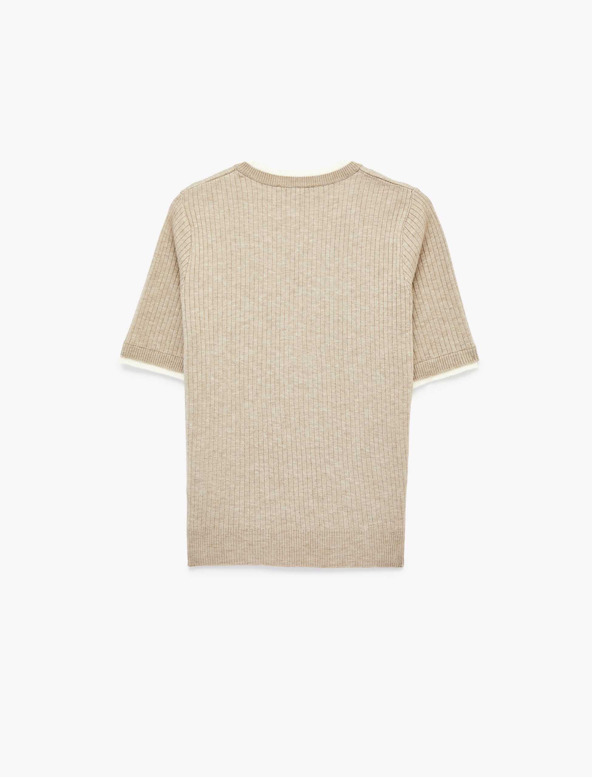 Button-Detail Viscose Knit Sweater with Short Sleeves and Double Collar