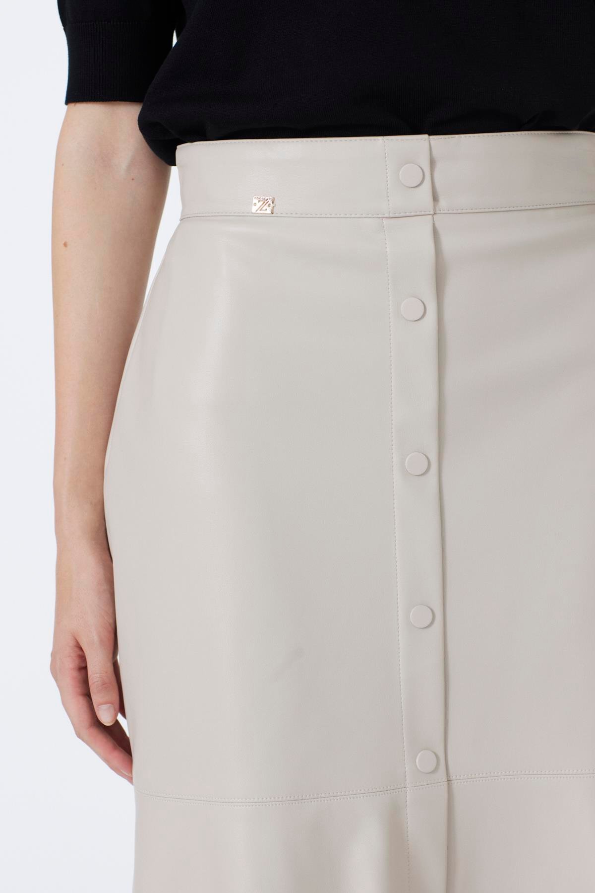 Tags: button-effect, flared skirt, high-waist skirt, leather-look skirt, stone color, women's fashion