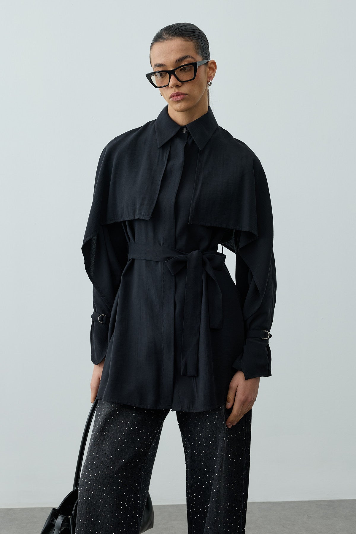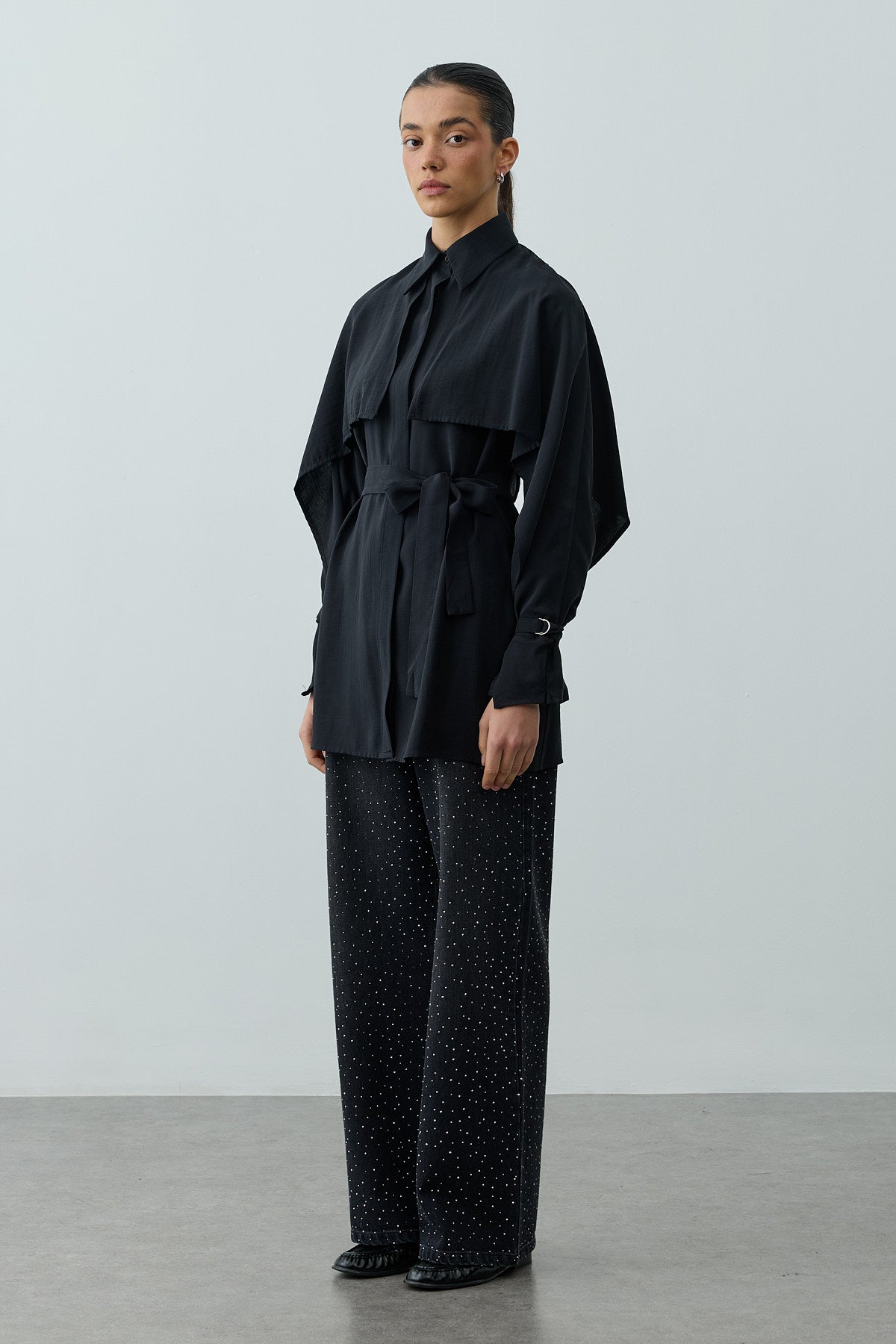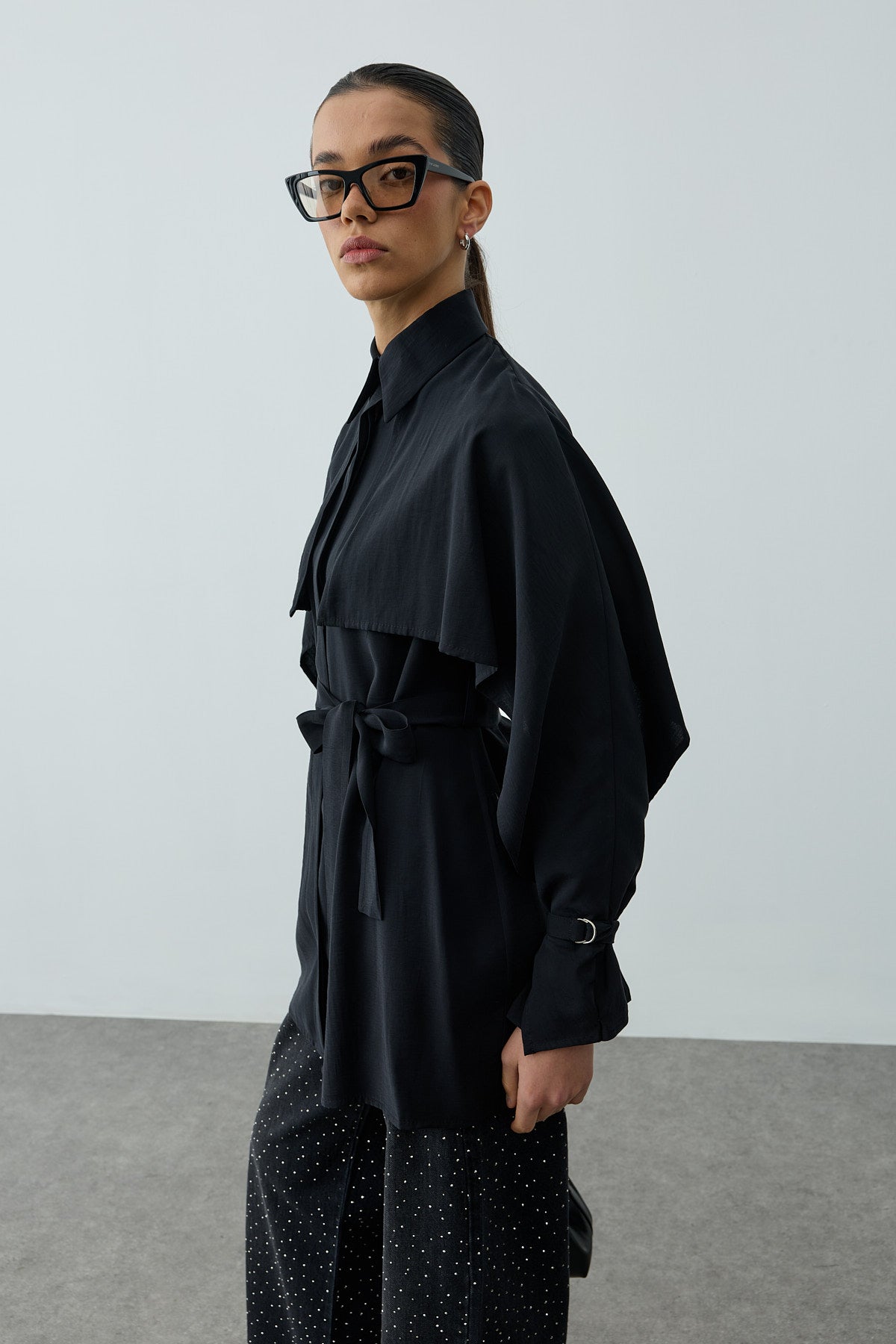 A long-sleeve shirt made from tensile woven fabric, featuring a classic shirt collar, elegant cape detail, metal buckle sleeves, a front placket, and button closure.