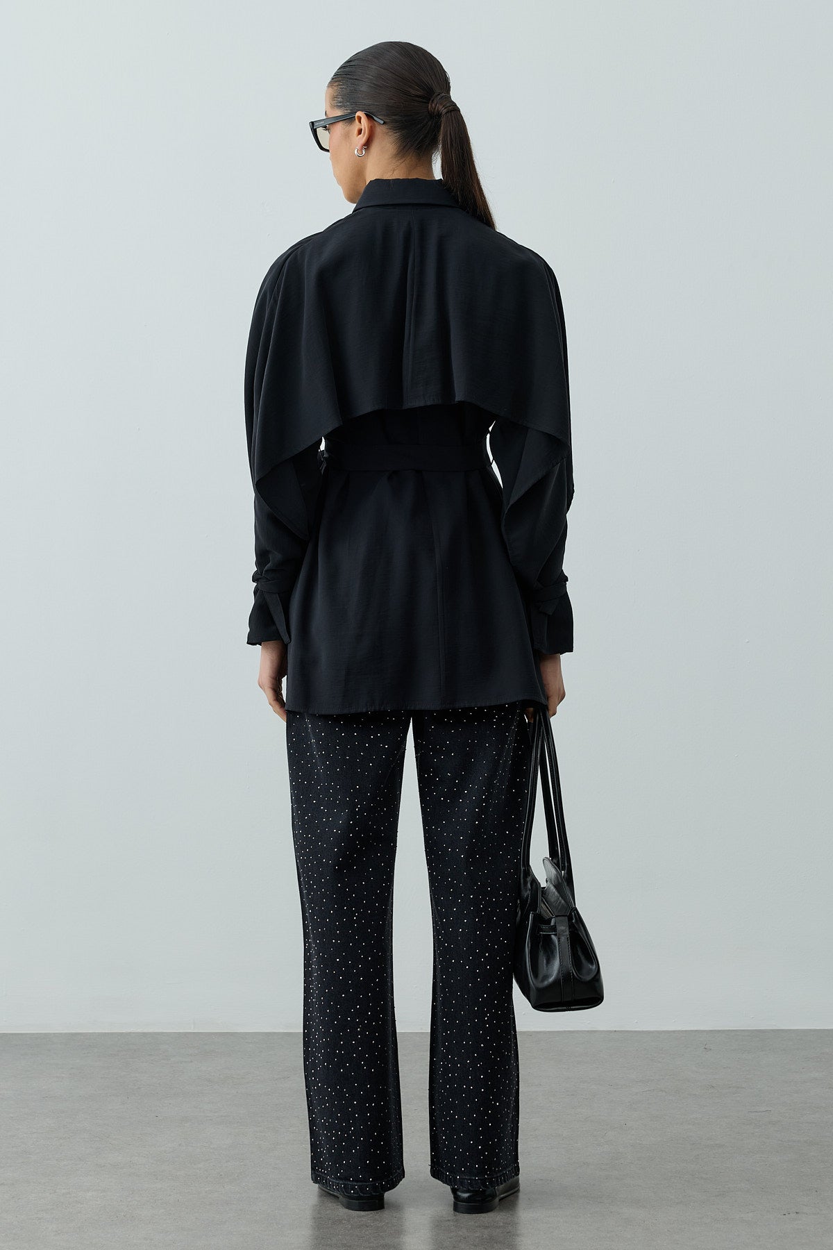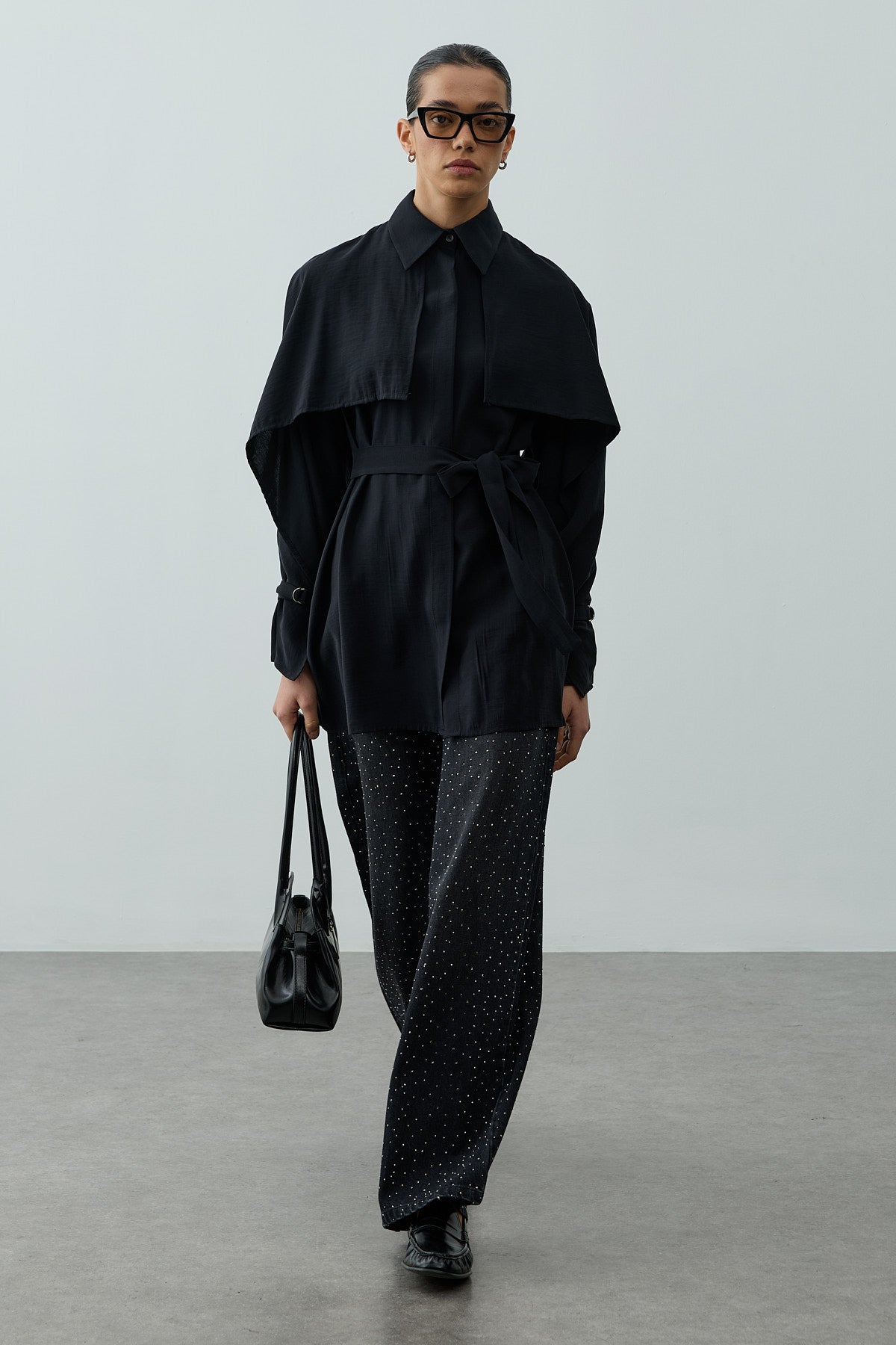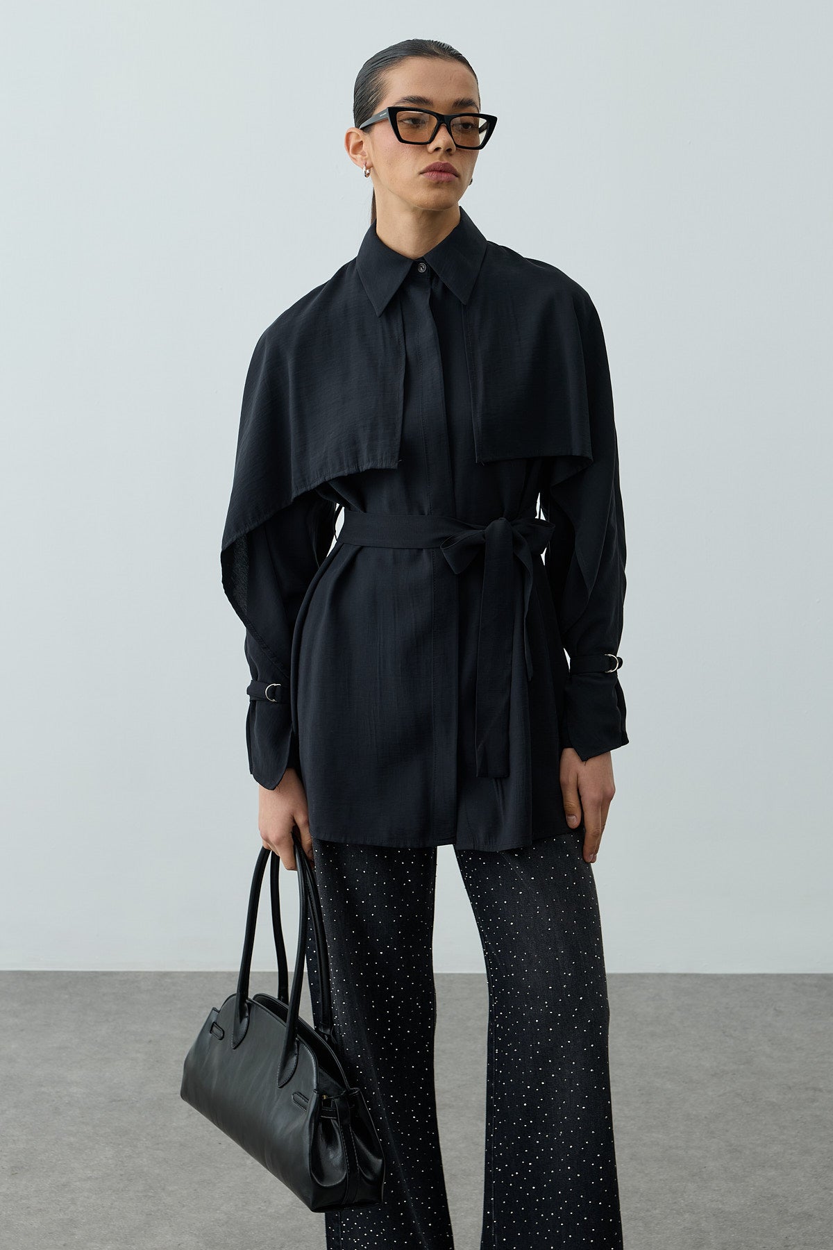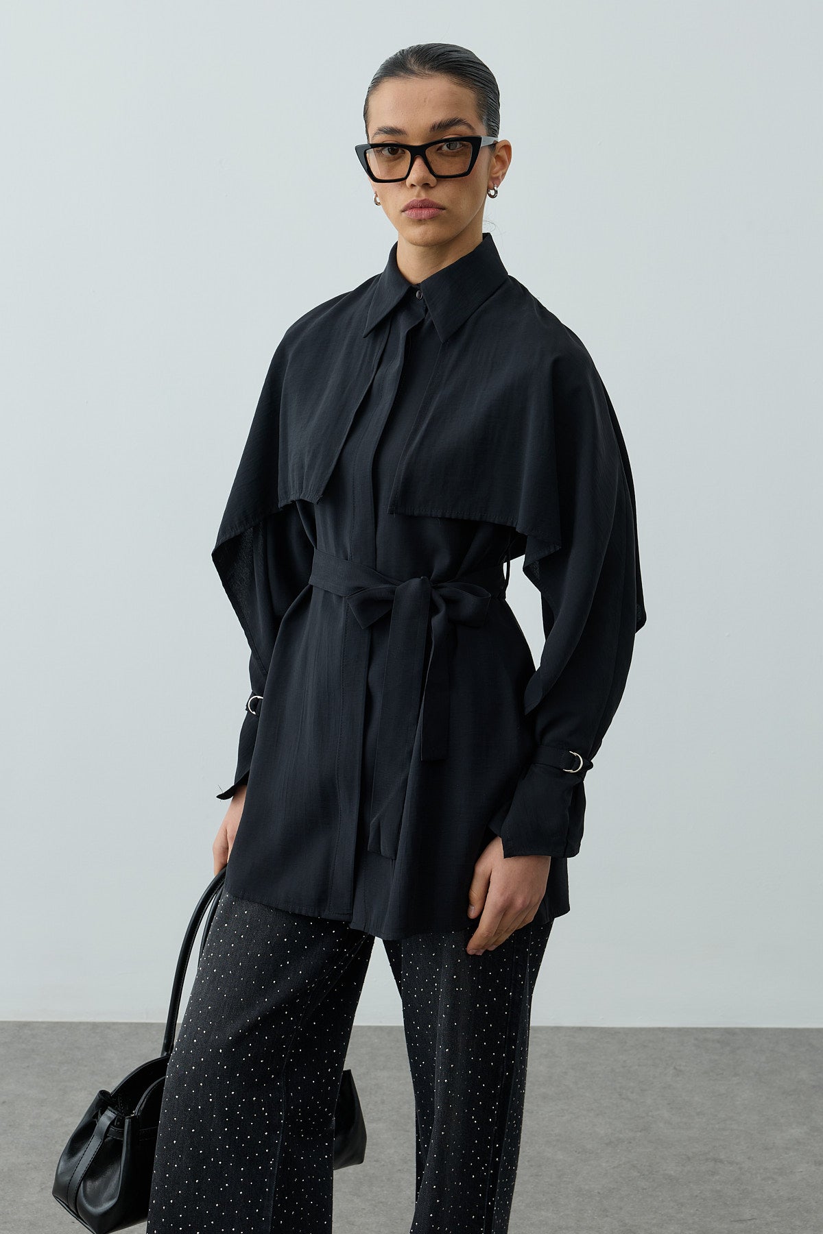 A long-sleeve shirt made from tensile woven fabric, featuring a classic shirt collar, elegant cape detail, metal buckle sleeves, a front placket, and button closure.