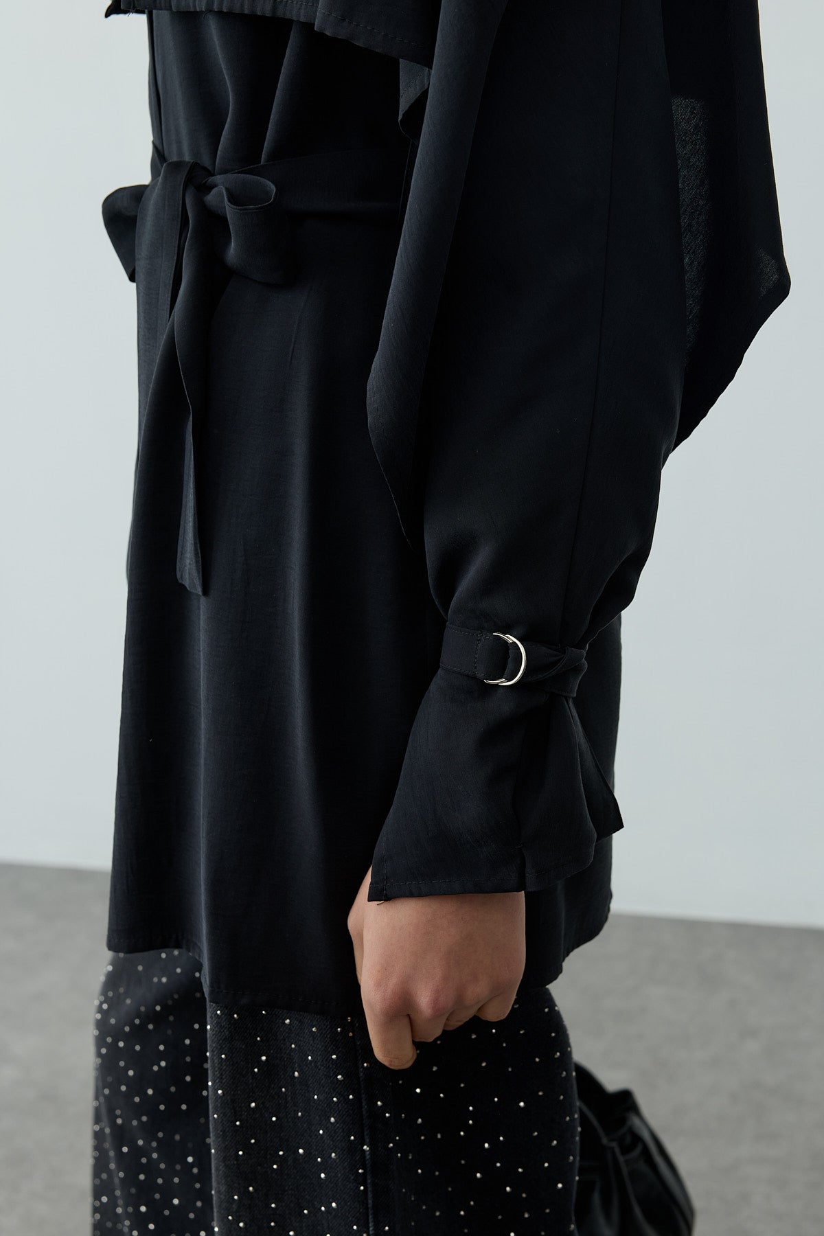 Tags: black shirt, button-up, cape shirt, long sleeve, metal buckle, rayon blend, women's fashion