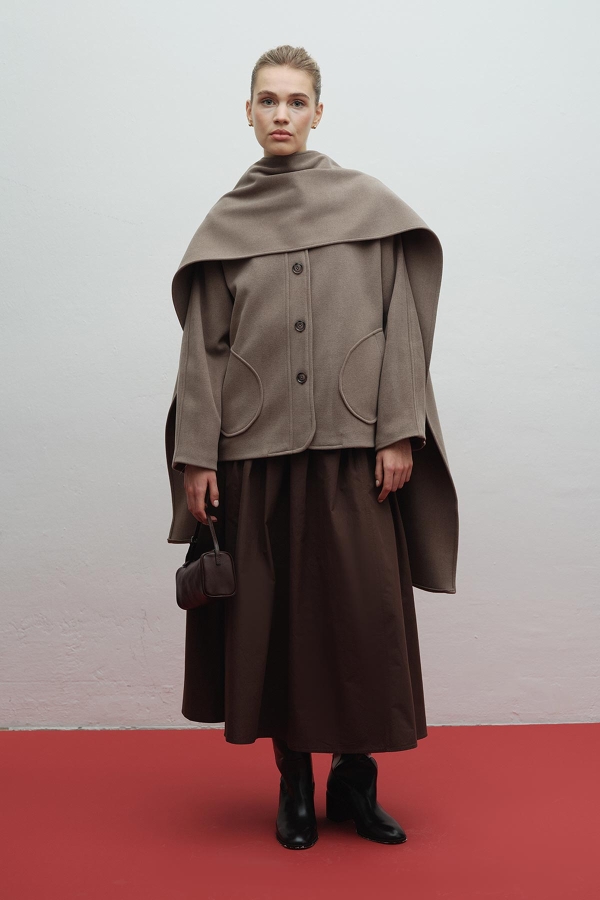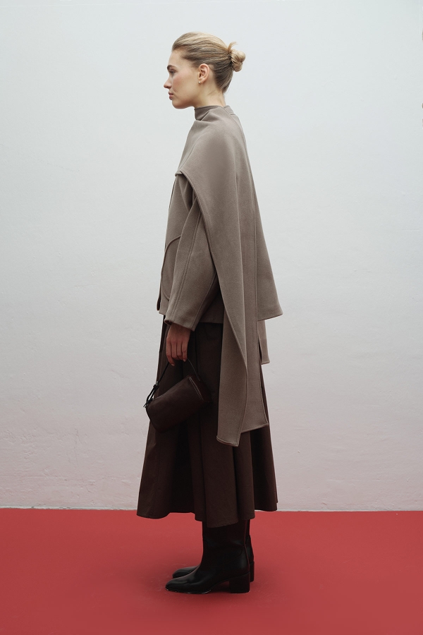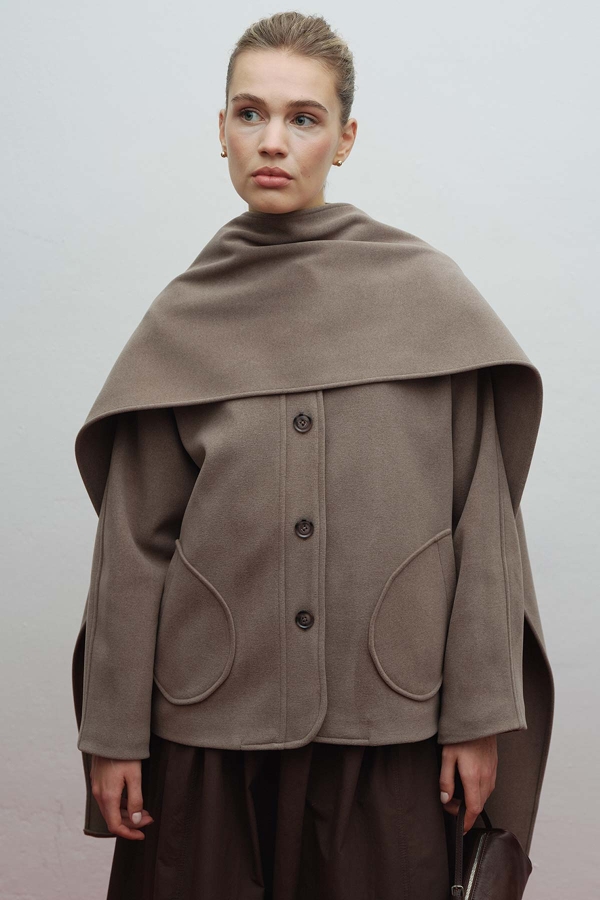 This coat features a shawl collar, front button closure, external pocket details, dropped shoulders, and includes a matching fabric scarf for optional styling. It is fully lined and has a luxurious cashmere-like appearance.