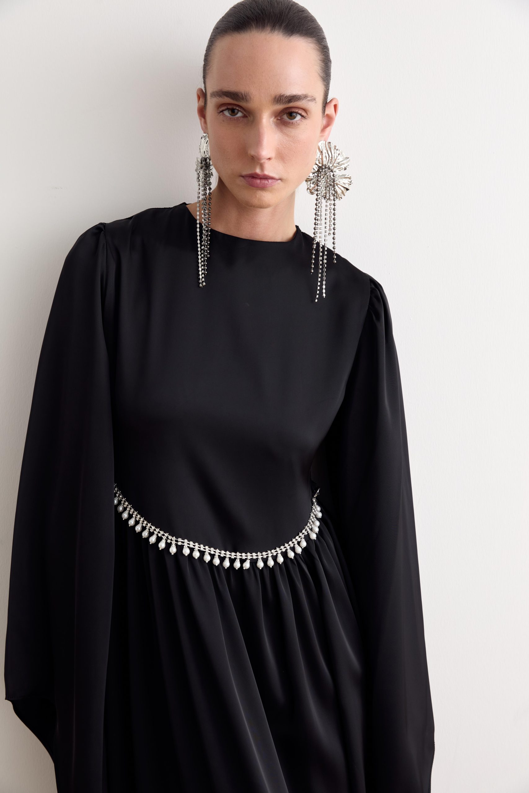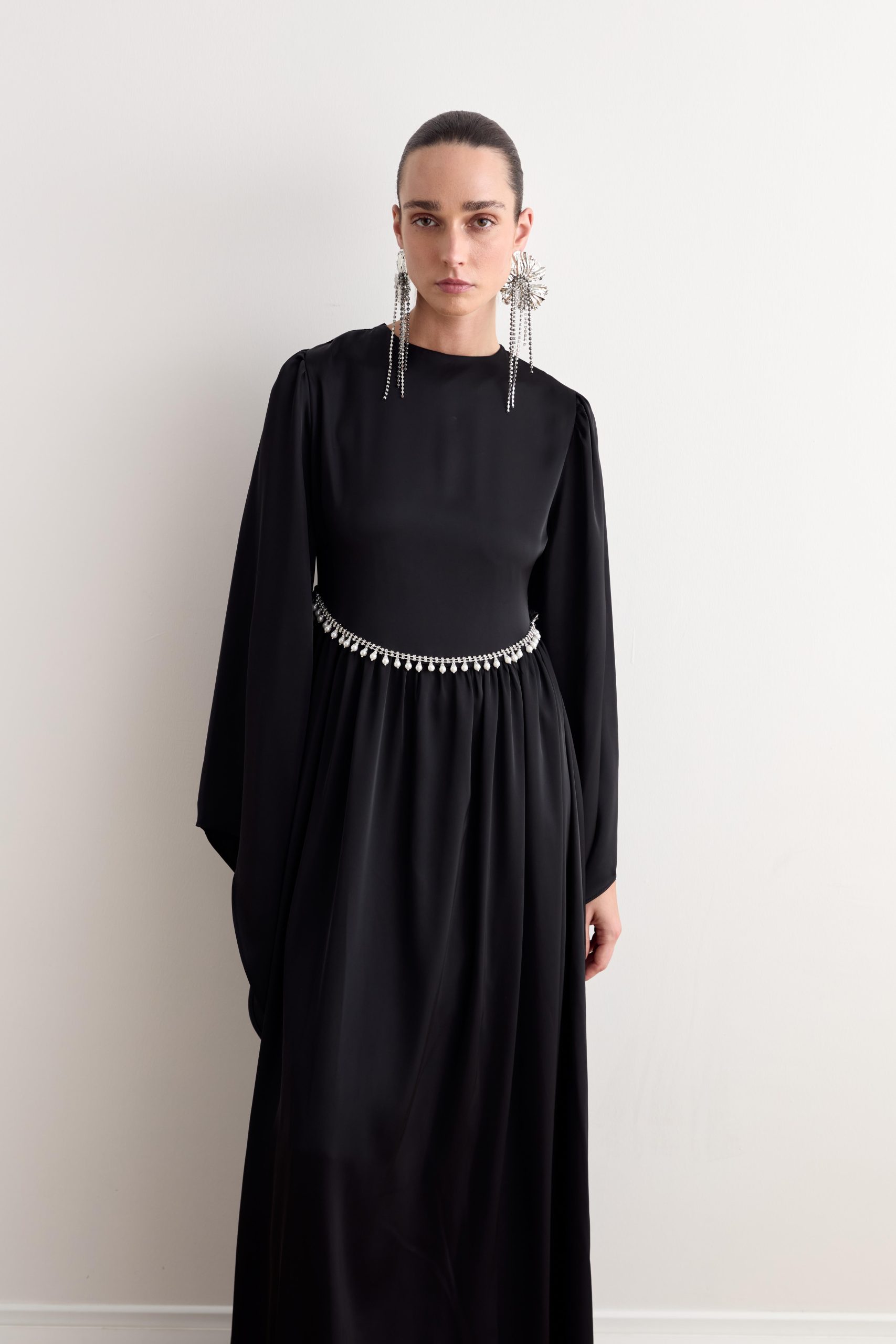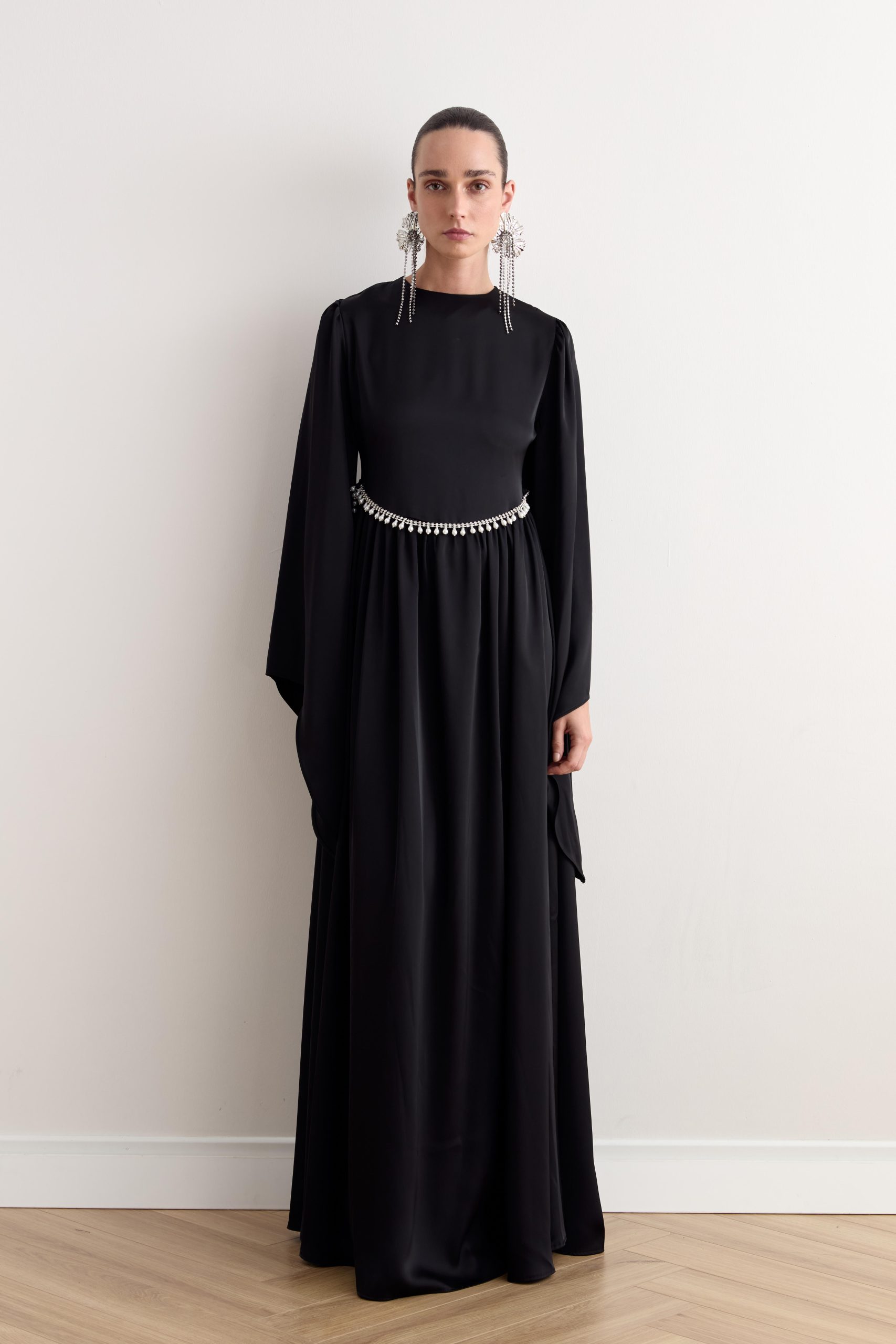 This elegant evening dress showcases a noble silhouette with its lustrous satin texture, reflecting sophistication in its simplest form through its refined cut and pearl-detailed belt. An ideal choice for those seeking a sophisticated look at invitations and special occasions.