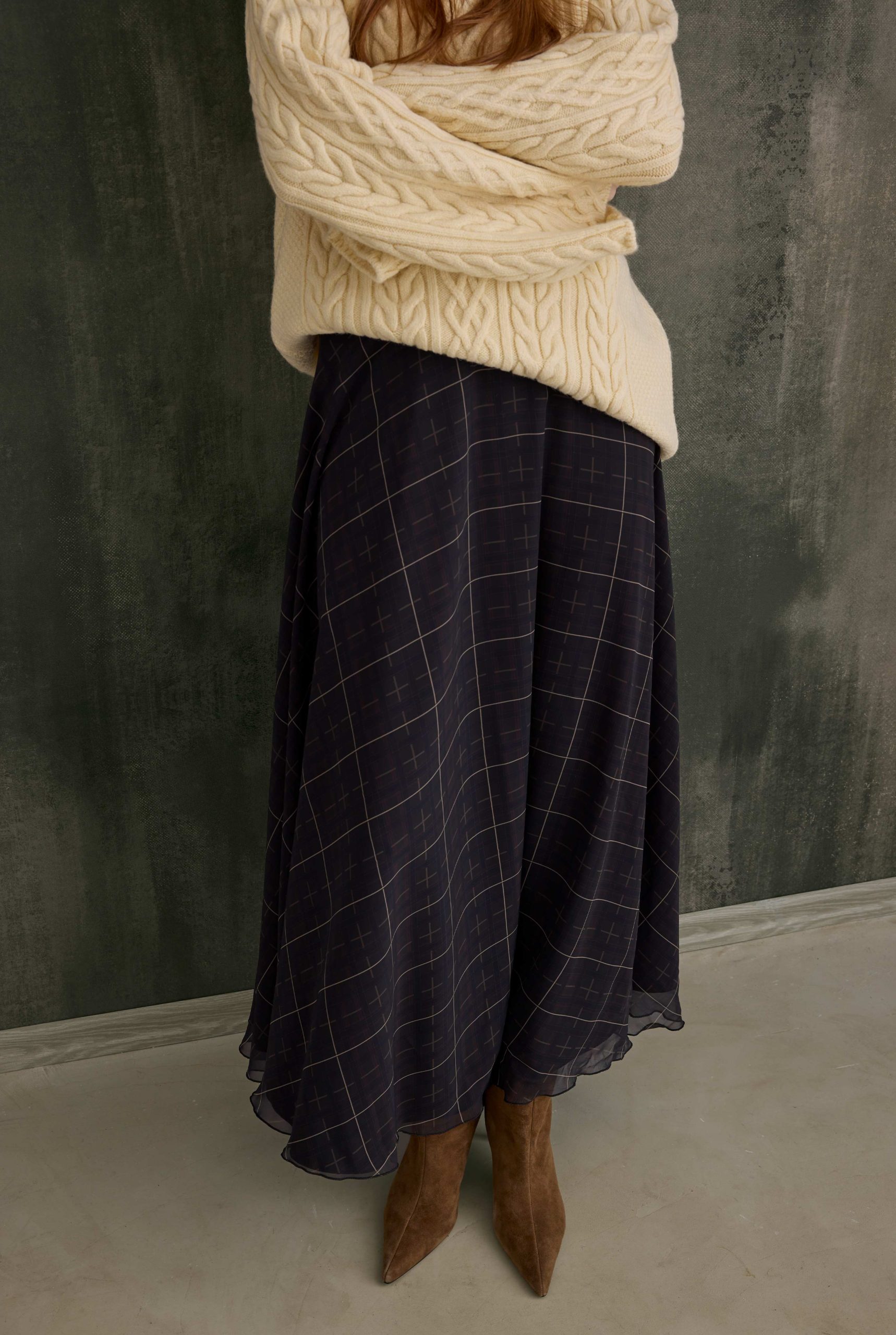 This chiffon plaid skirt, made from 100% polyester fabric, is designed with a polyester base to preserve the clarity, vibrancy, and long-lasting quality of the printed patterns. The polyester fabric ensures that the colors remain vivid and the lines stay sharp over time, while its lightweight structure supports the skirt’s fluid and airy drape. The plaid motifs are specially illustrated with attention to collection harmony, giving the design a distinctive and characteristic identity.