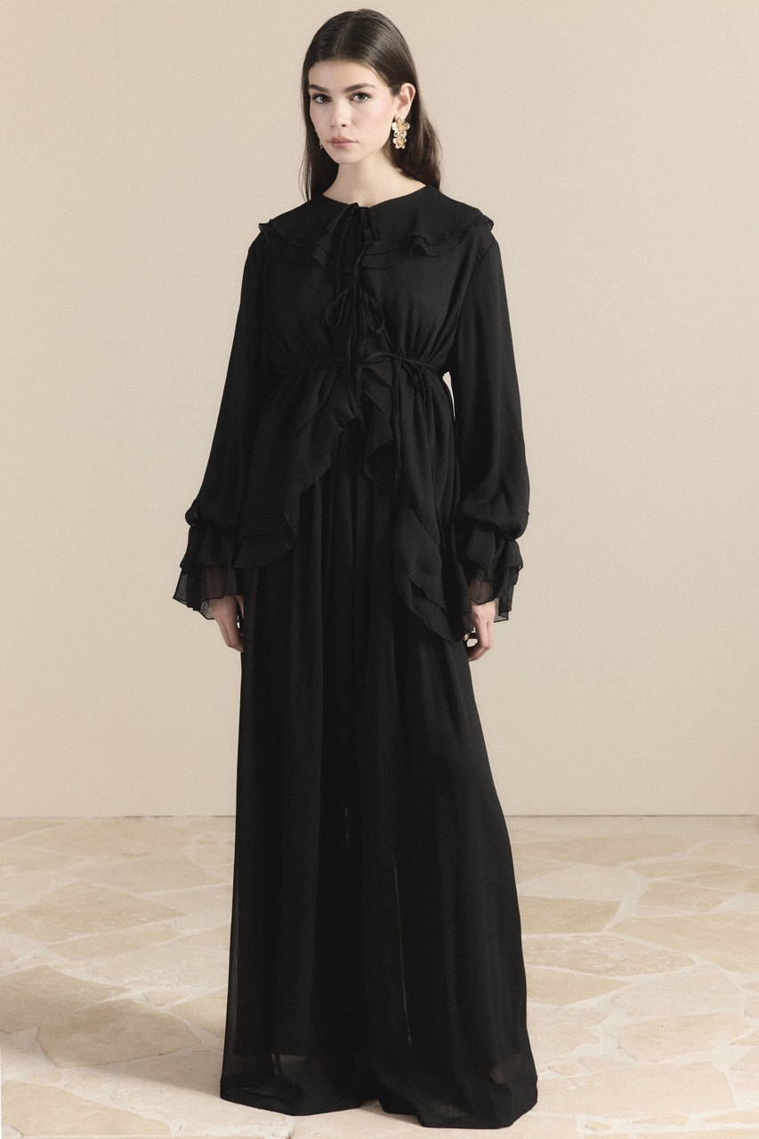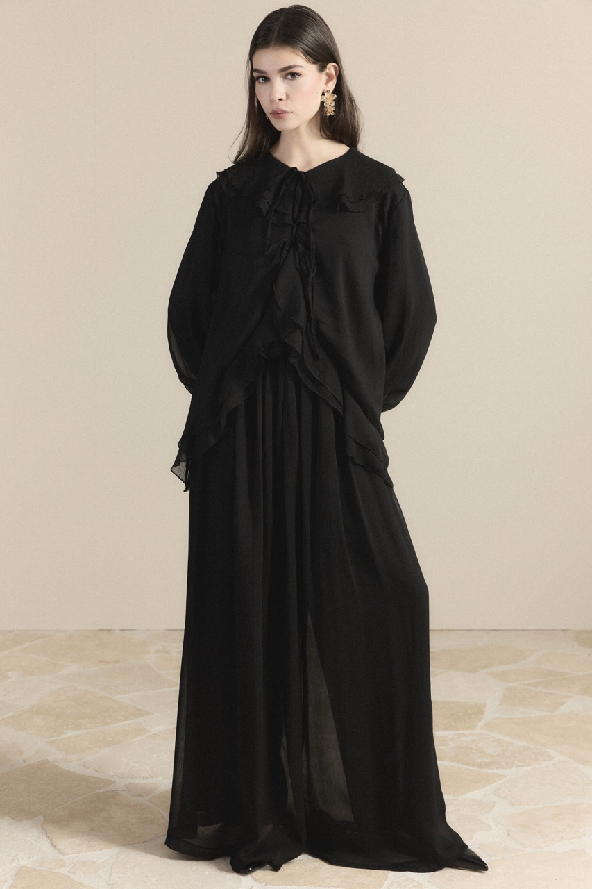Chiffon Set with Ruffled Neckline and Sleeves – Black