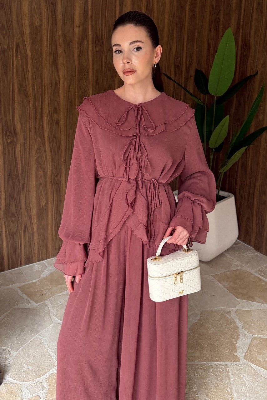 This special set combines romantic lines with elegant details, offering simple sophistication through its soft texture. The layered ruffles on the bust and skirt areas add movement to the design, while the lace-up details at the front create a nostalgic feel. The balloon-shaped sleeves and wrist details provide an elegant appearance, and its draped structure ensures all-day comfort. This feminine and serene-looking set is an ideal choice for both daily wear and special occasions.