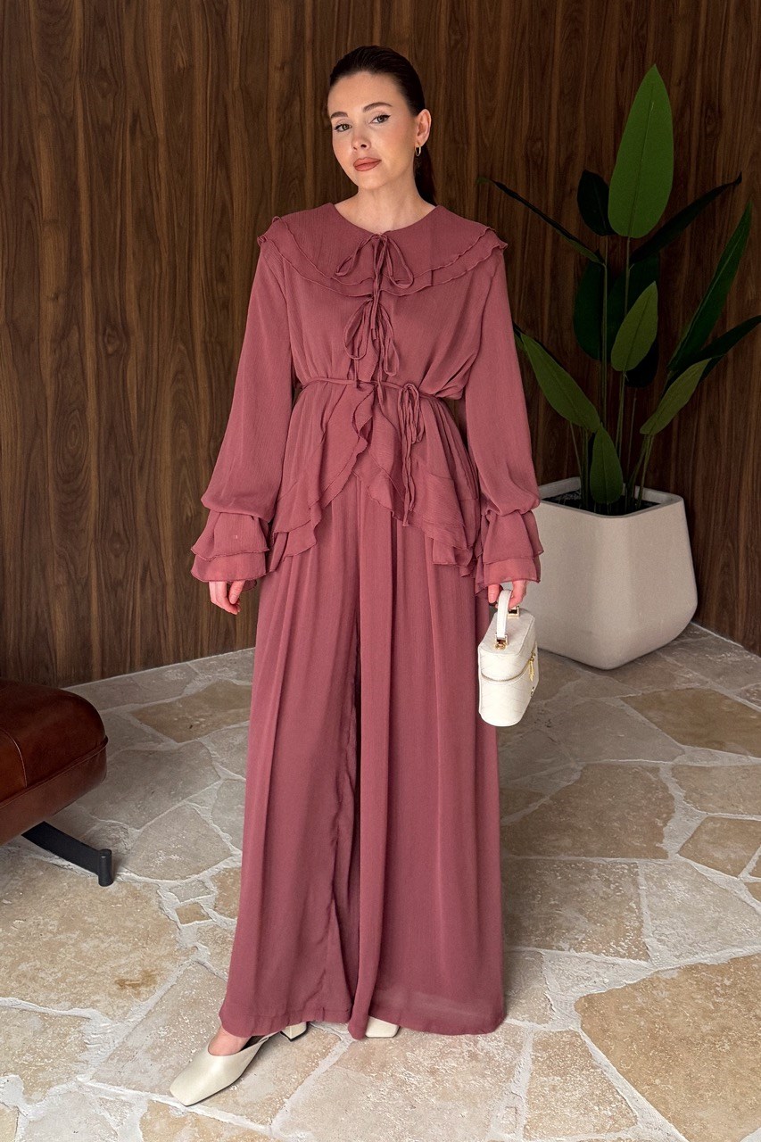 Be the first to review “Chiffon Set with Ruffled Neckline and Sleeves – Pink”
