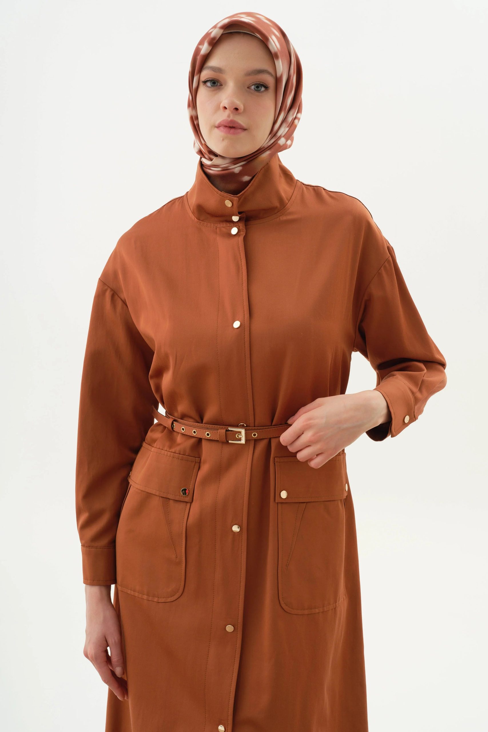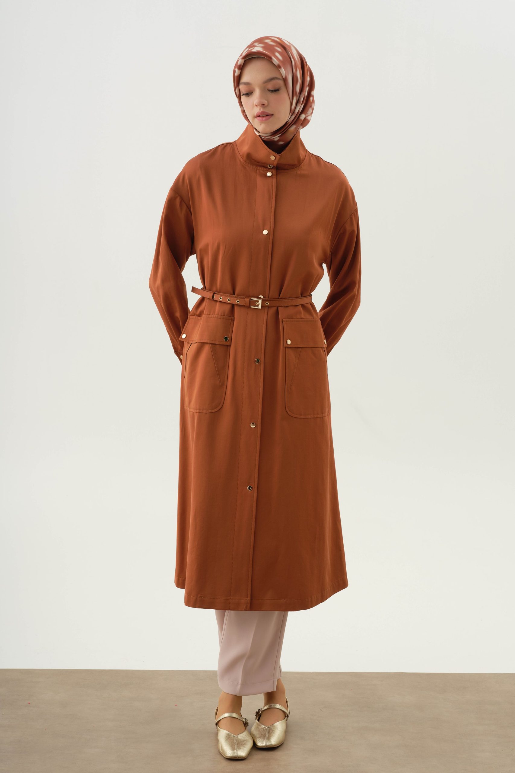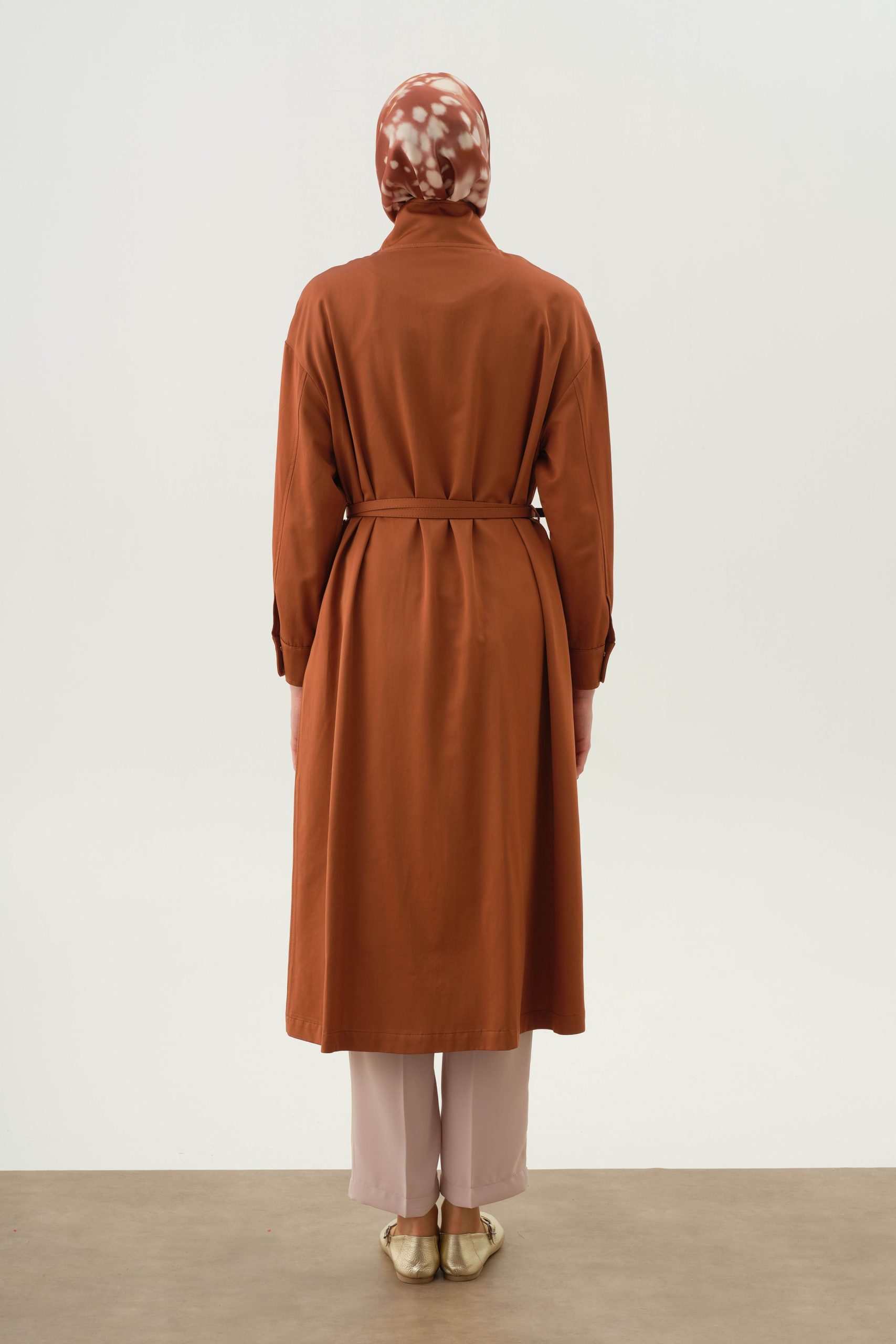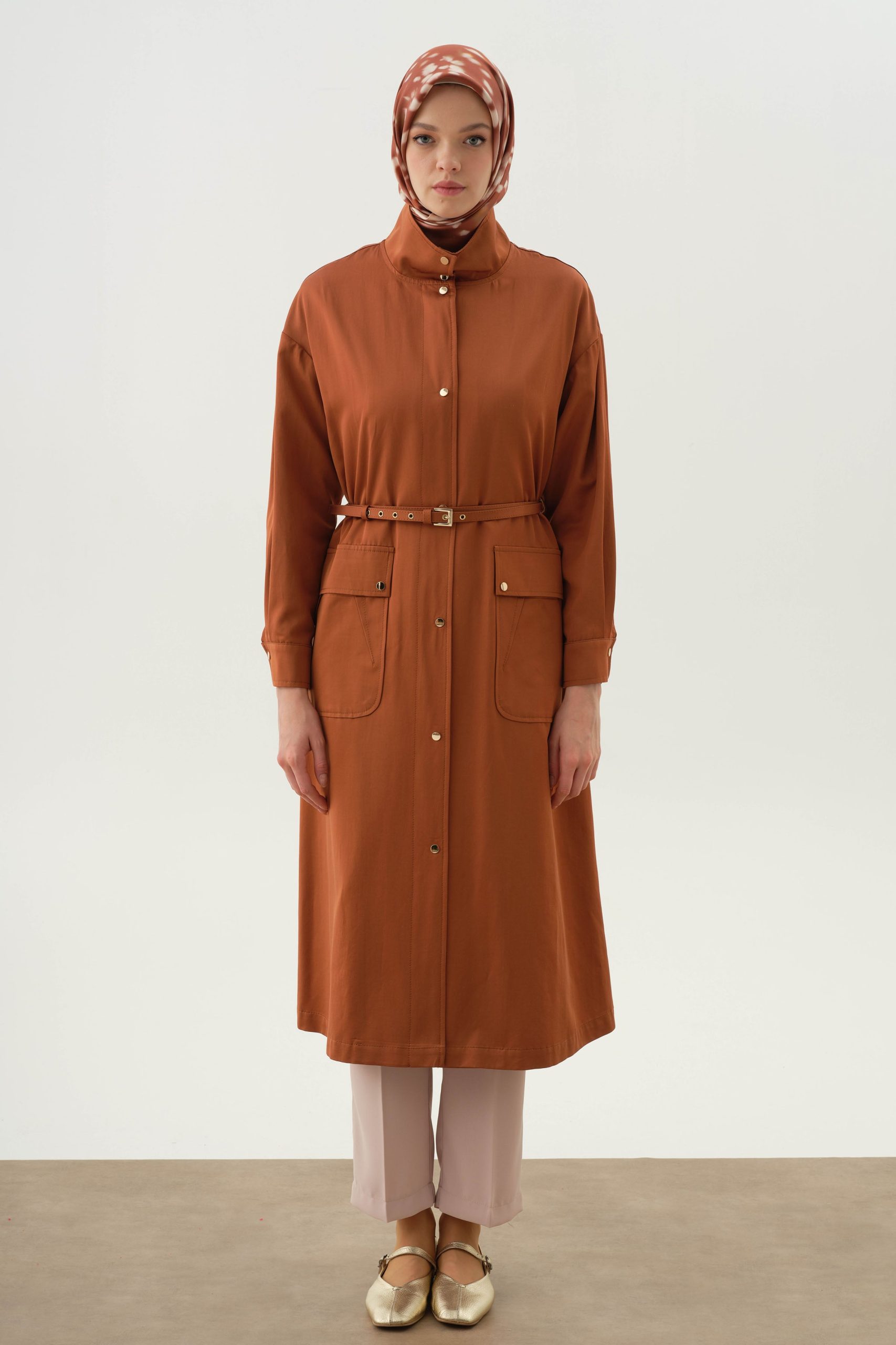 Cinnamon Belted Coat with Stand Collar