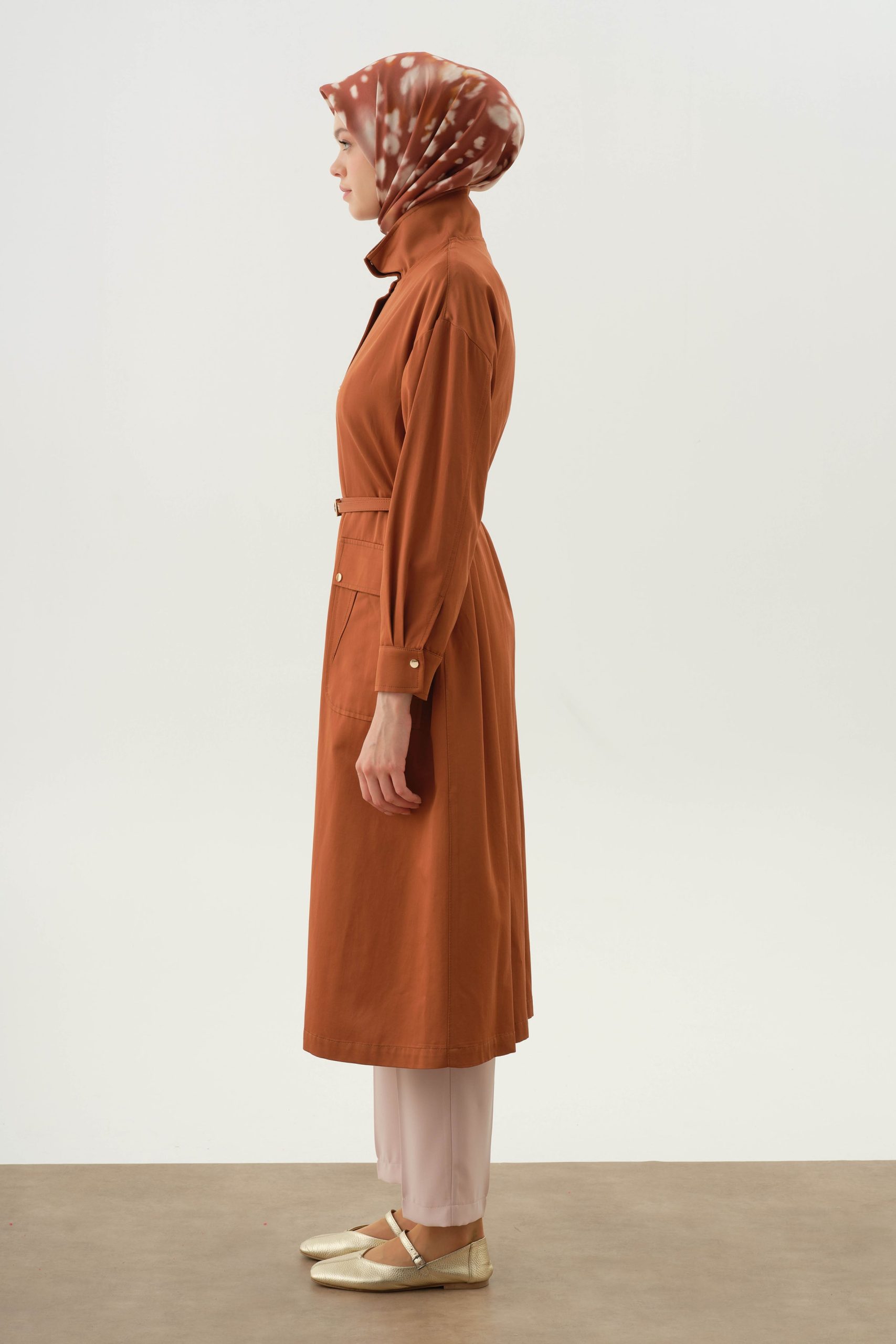 This coat offers an elegant silhouette with its chic stand collar detail and belt tied at the waist, showcasing a modern and strong posture. Its straight form enhances even the simplest outfits. An ideal piece to add a sophisticated touch to your daily style!