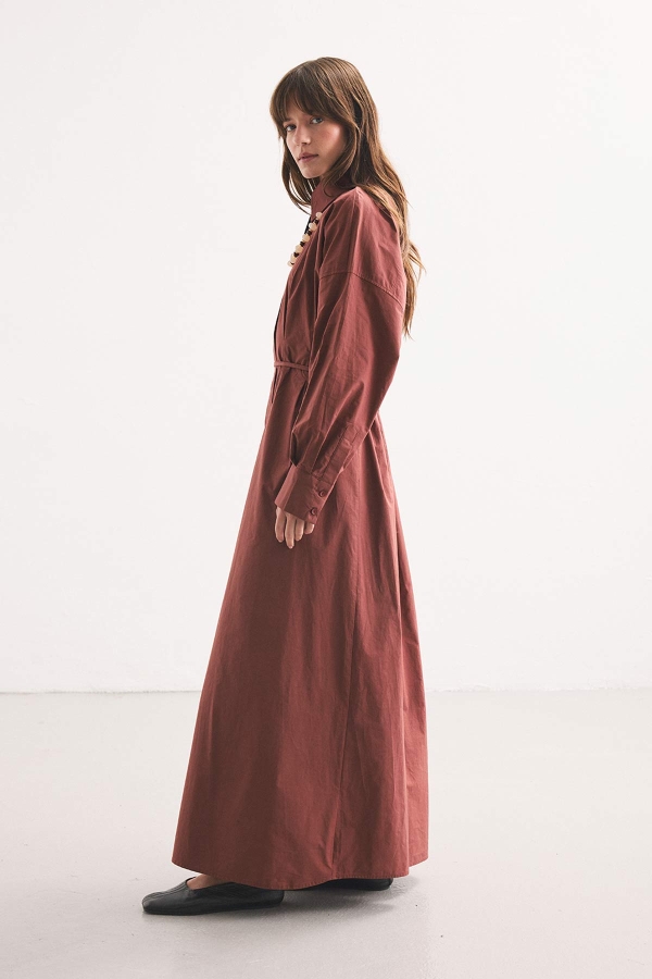 Tags: button closure, cinnamon, cotton, pleat detail, regular fit, shirt dress
