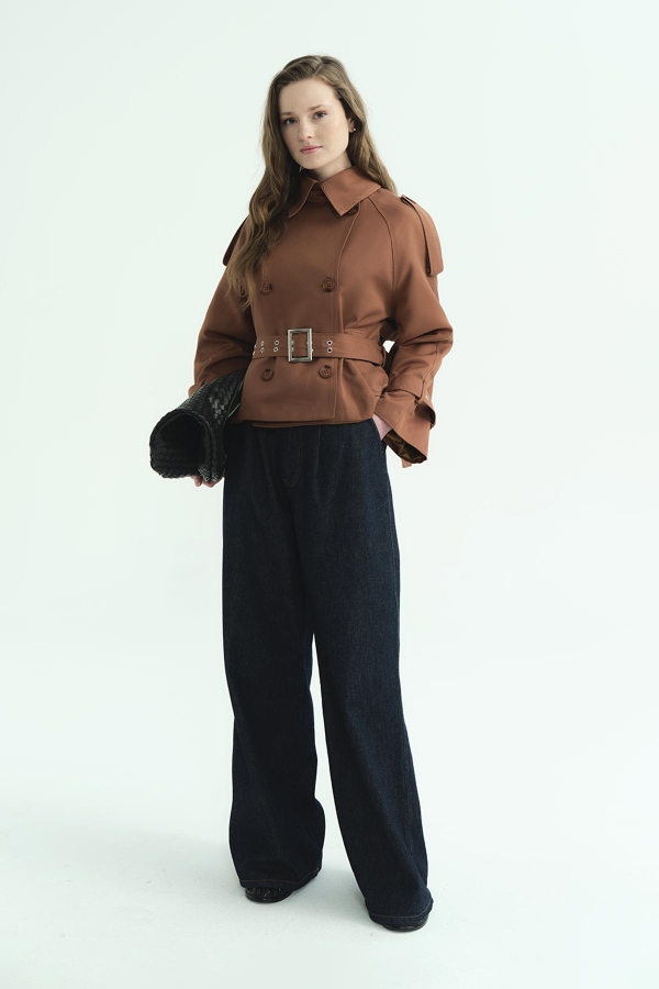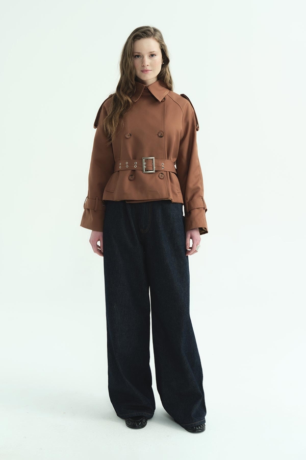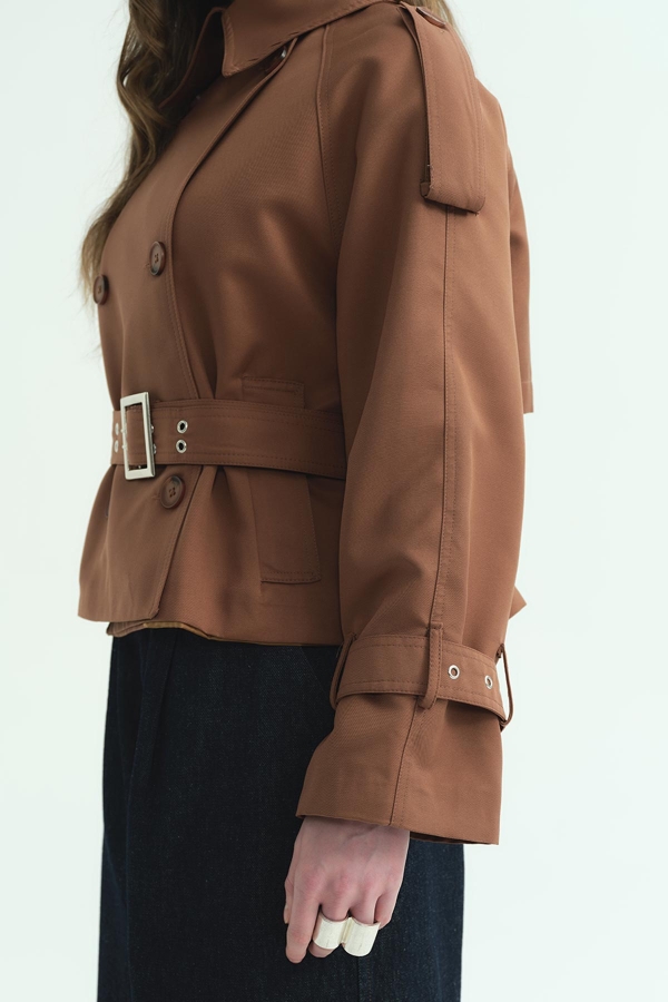 Tags: belted, cinnamon, crop length, jacket collar, outerwear, regular fit, short, stylish coat, trench coat, women's fashion