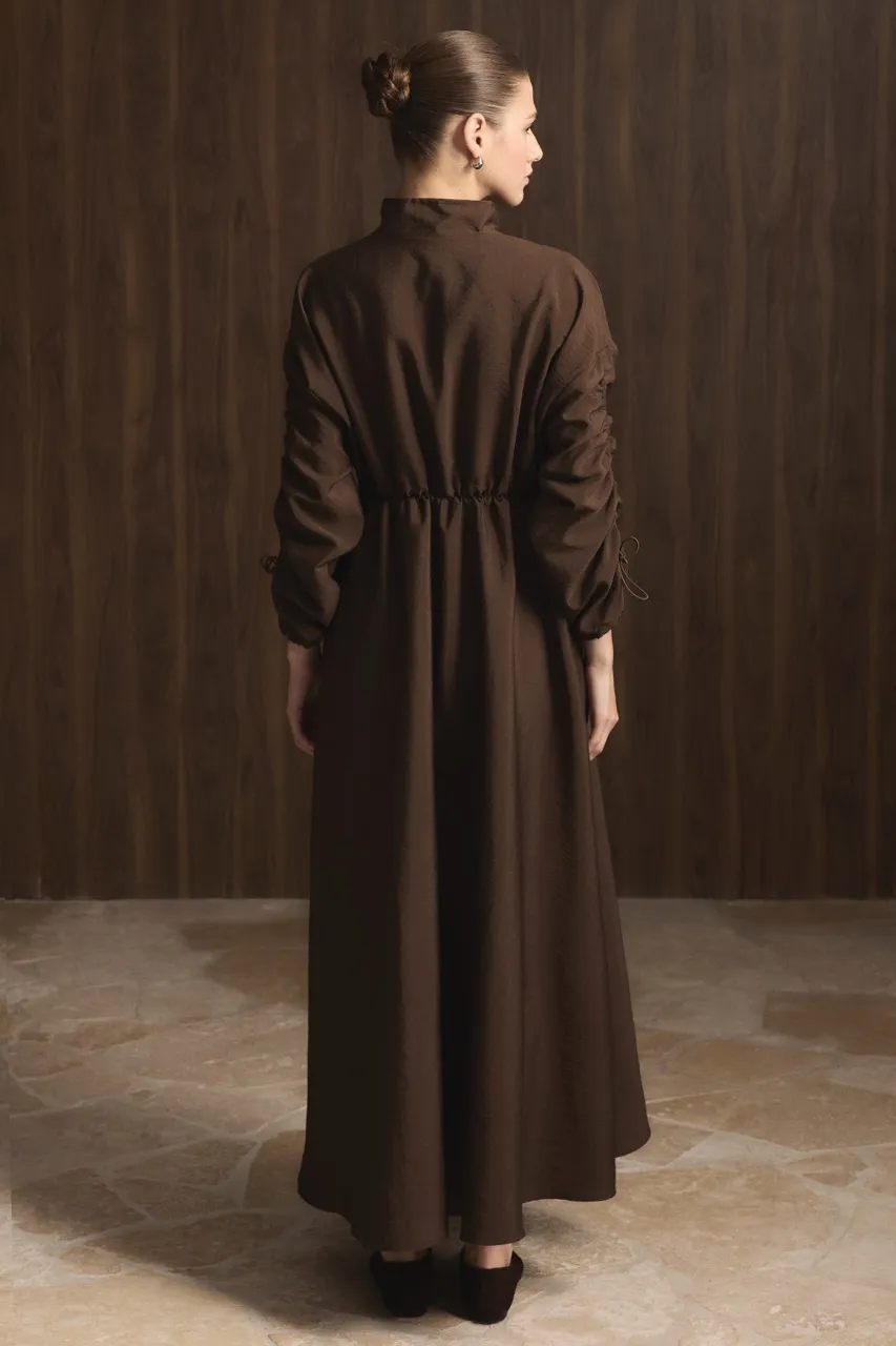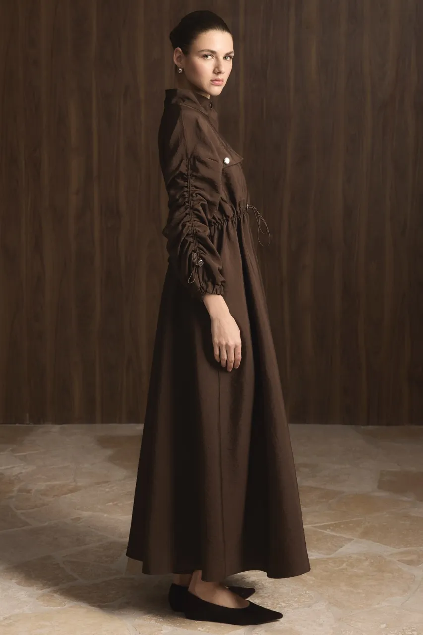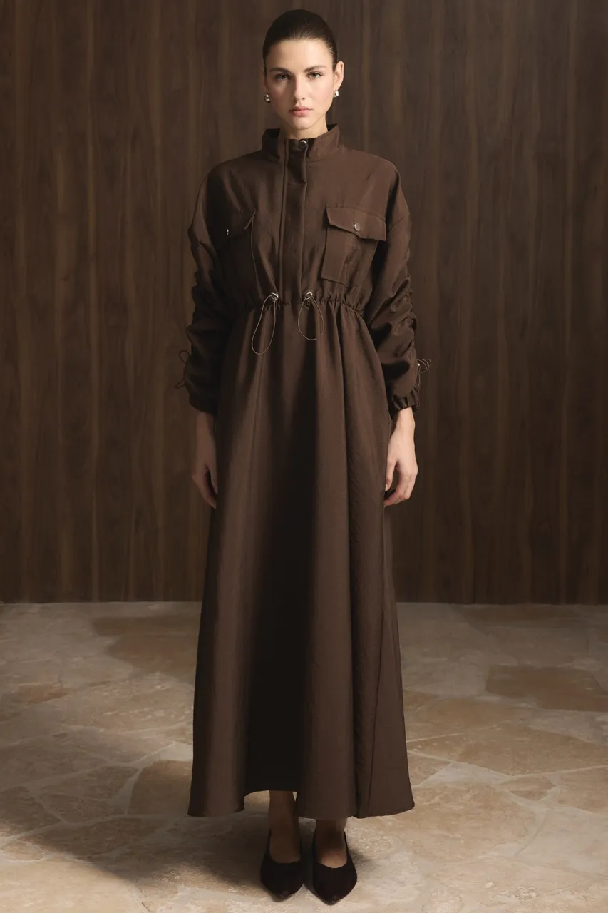 Coffee-Colored Belted Tunnel Detail Dress with Double Pockets