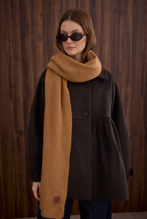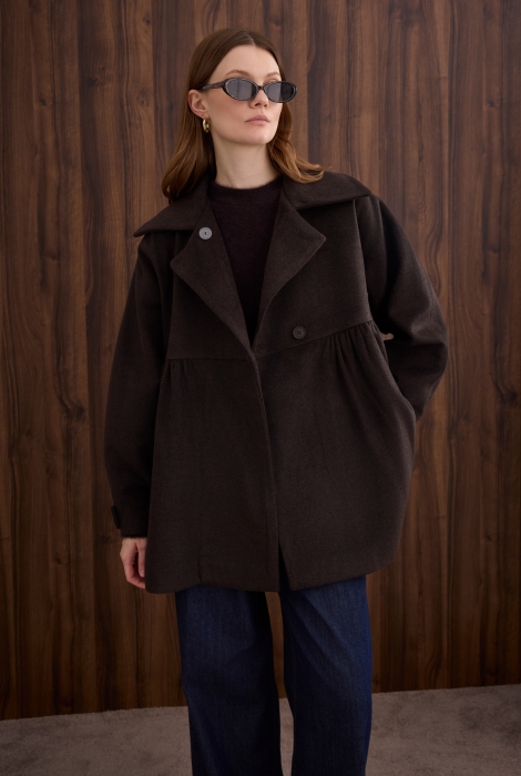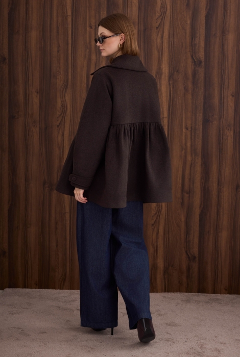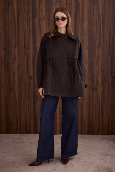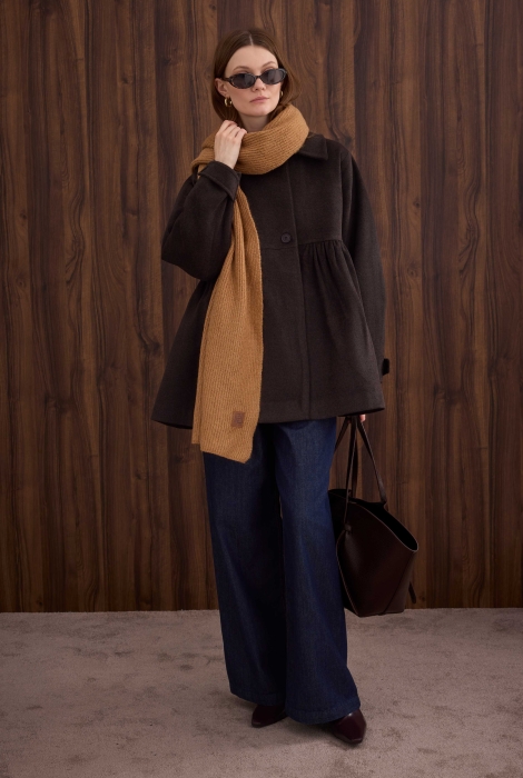 Crafted from 100% acrylic yarn, this coat offers lightweight warmth and comfortable wear in cold weather. The soft texture and firm structure of acrylic fabric provide both voluminous form and long-lasting durability. With a modern and charming silhouette, this model gains movement through gathering details while ensuring comfort in daily use. It combines elegance and comfort in your outerwear ensembles.