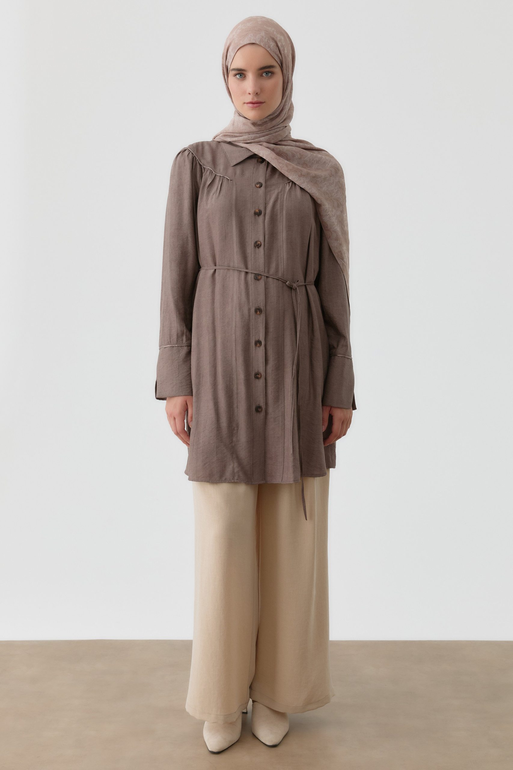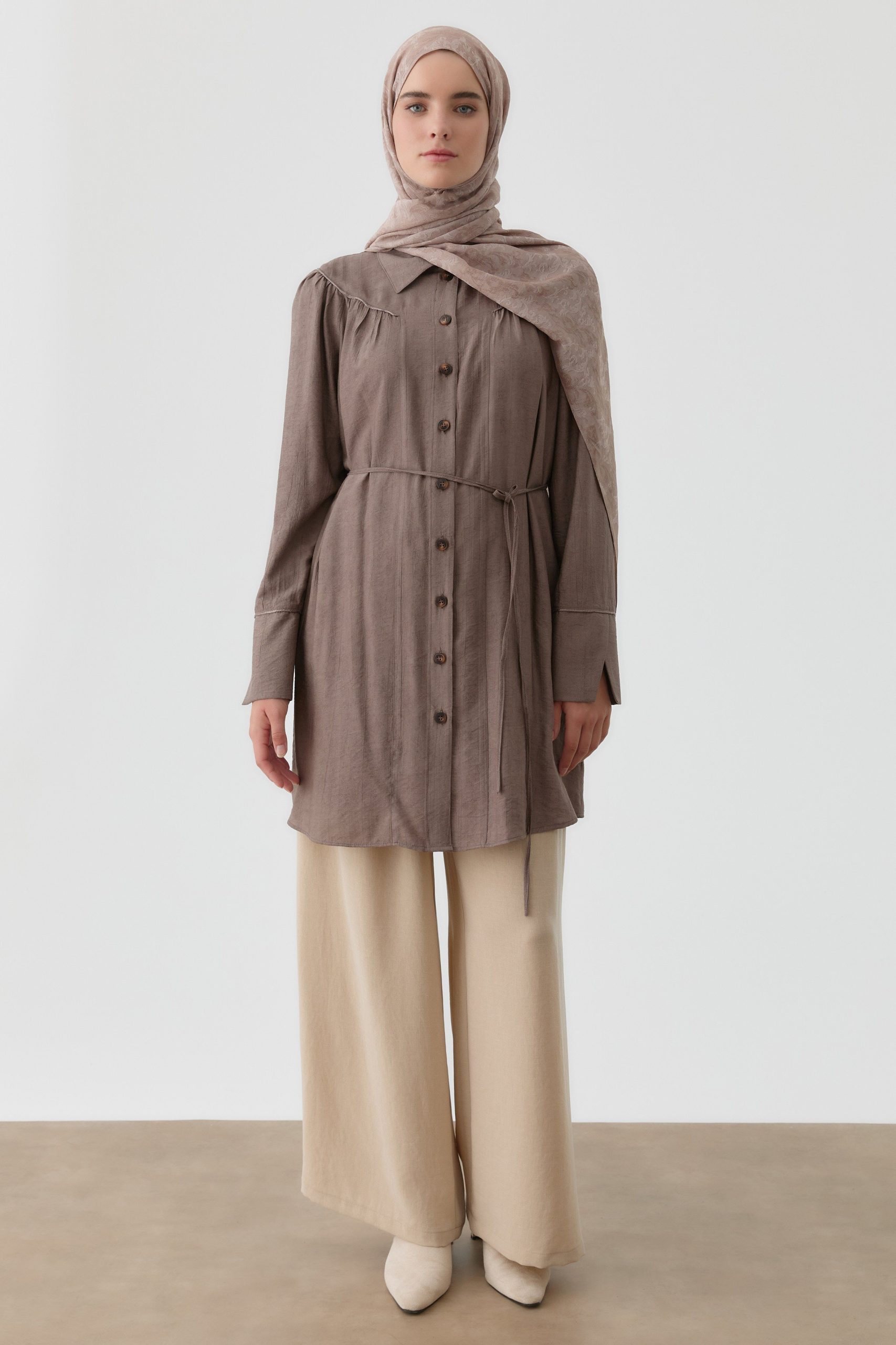 This tunic stands out with ruffle and gathered details, offering light movement and elegant dynamism with every step. Its lightweight, flowing fabric ensures all-day comfort, while the modern cut adds sophistication to your daily and special outfits.