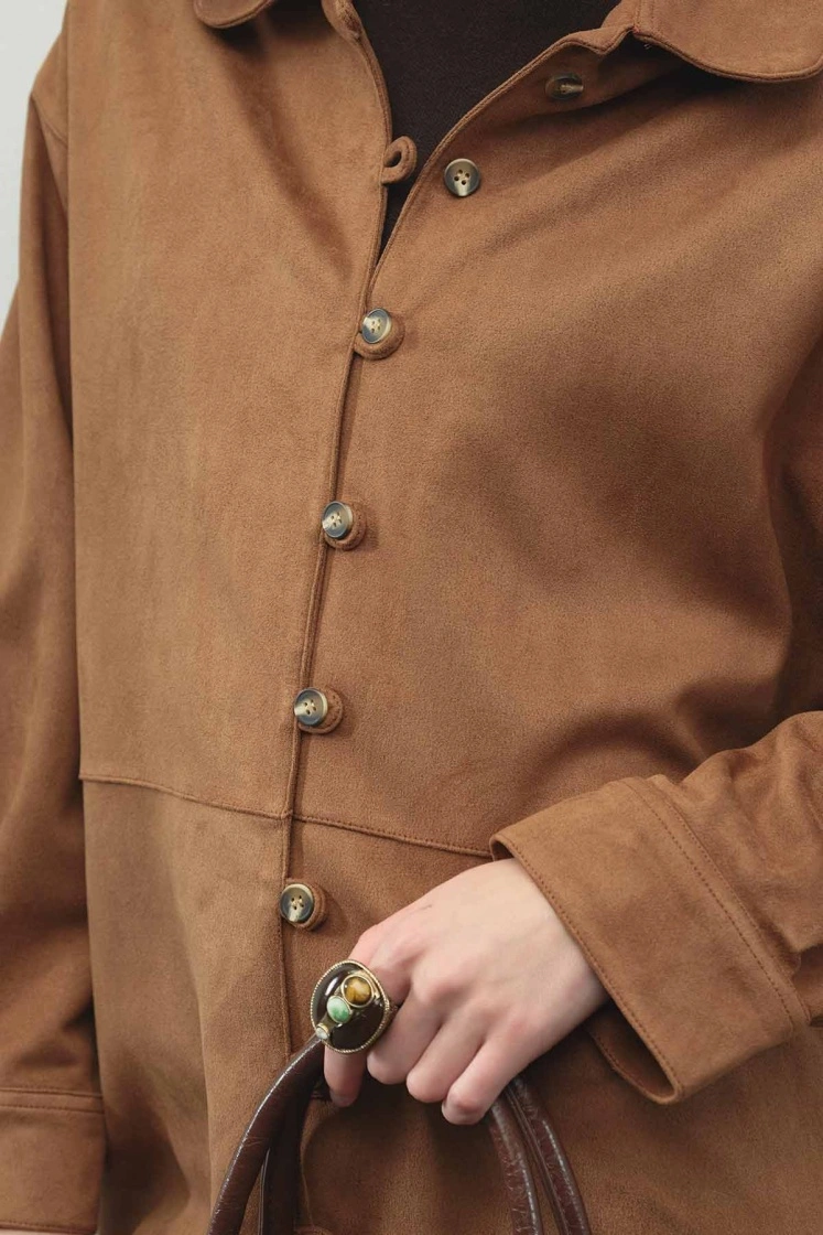 Special design suede shirt with birit closure buttons, comfortable fit, and soft texture.