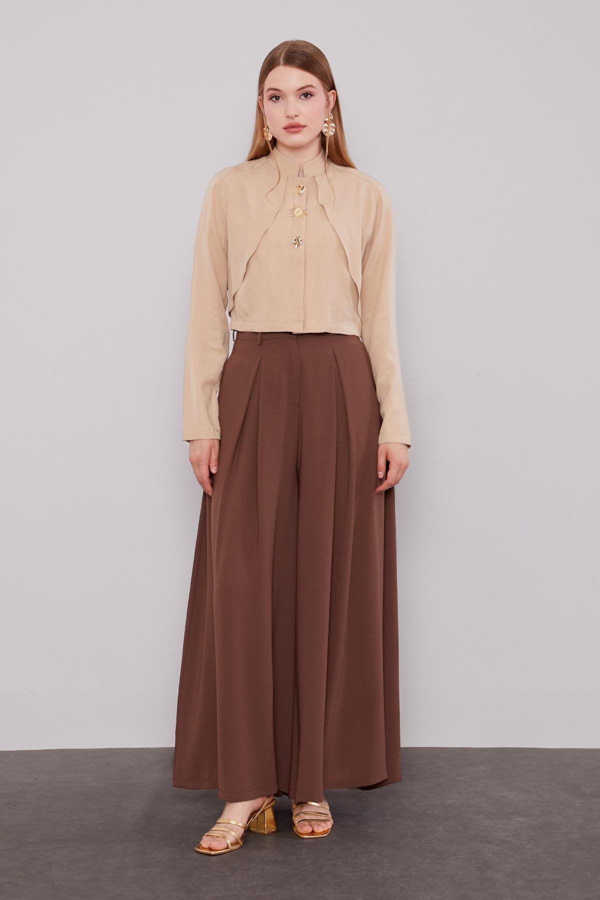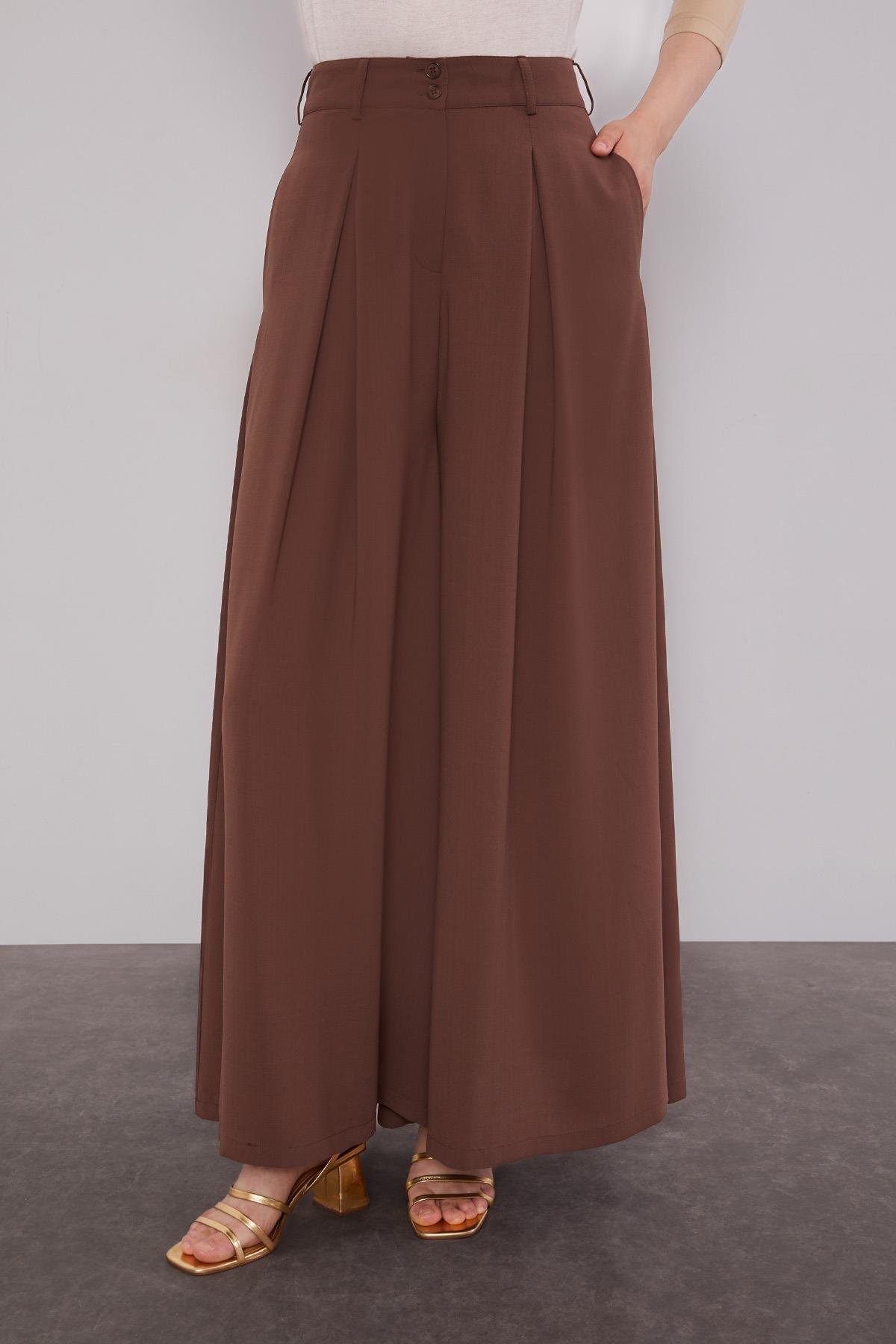 This wide-leg pleated trouser skirt combines the comfort of trousers with the appearance of a skirt, creating a unique style with its wide-leg design. The pleat details add movement and dynamism to the product, creating a sophisticated atmosphere. The high-waist cut helps your legs appear longer and makes your outfits look more stylish. Thanks to its four-season usability, it is among the indispensable pieces of wardrobes. It offers versatile styling opportunities that easily match with both sneakers and high-heeled shoes.