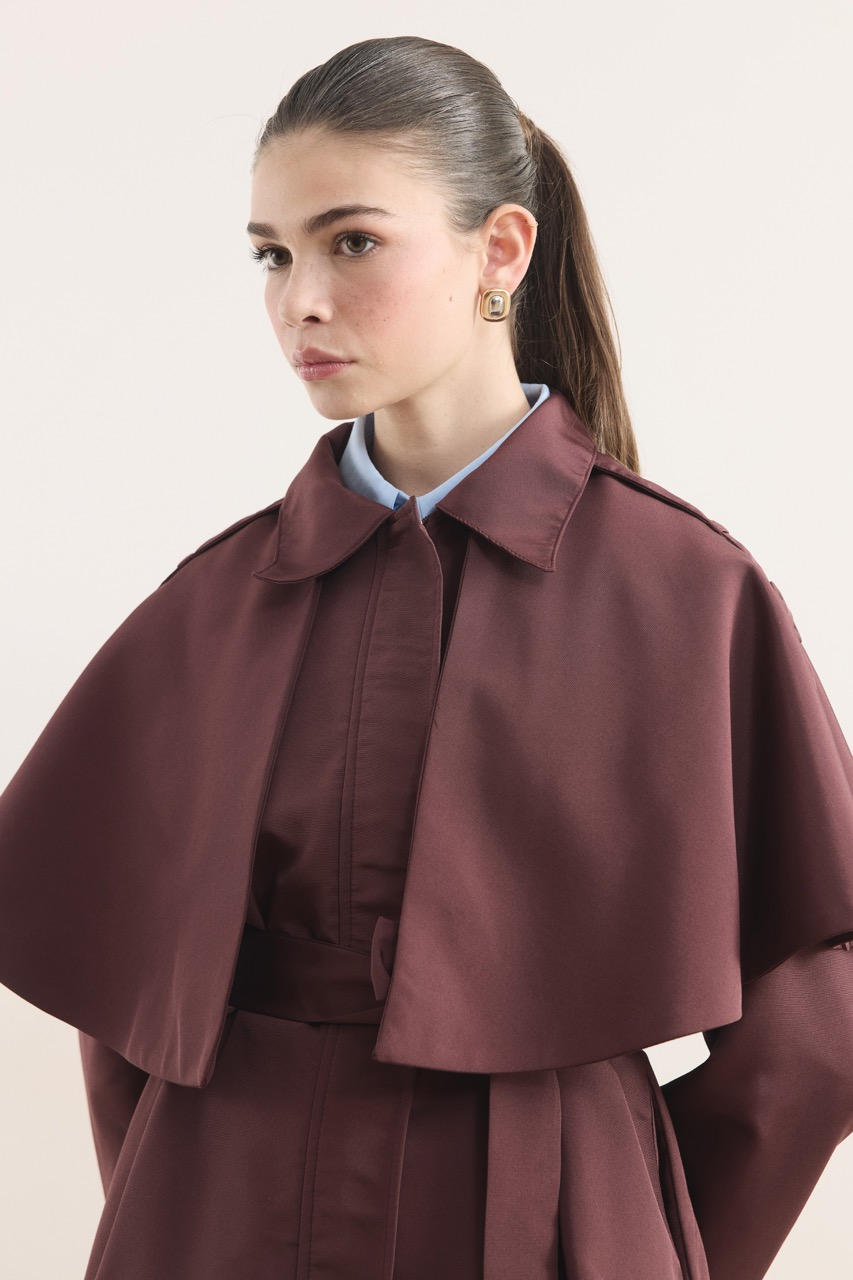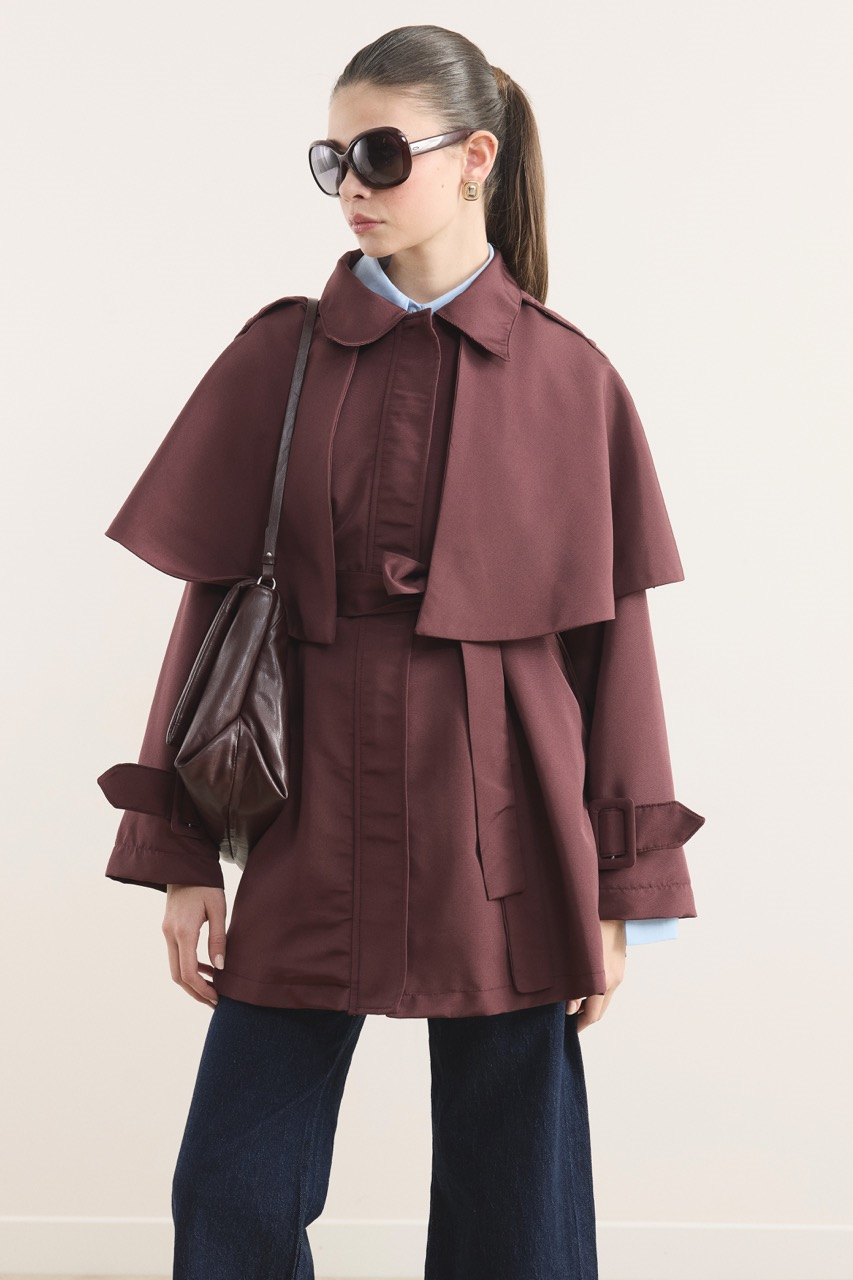 This short trench coat features elegant collar detailing and sophisticated belted sleeves for a chic, modern look. Crafted in a rich burgundy hue, it offers versatile styling for various occasions.